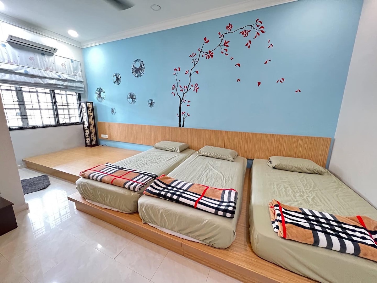 Dies ist ein Familienzimmer für 5-7 Personen, das Zimmer verfügt über eine Klimaanlage und ein eigenes Bad mit einem Wasserkocher. * Homestay ist ein zweistöckiges Terrassenhaus im Sicherheitsbereich mit 5 Zimmern, 5 Badezimmern, Klimaanlage im Zimmer und einem Whirlpool im Badezimmer. Es gibt auch einen Park vor der Privatunterkunft, in dem du und deine Kinder Spaß haben und sich entspannen können.