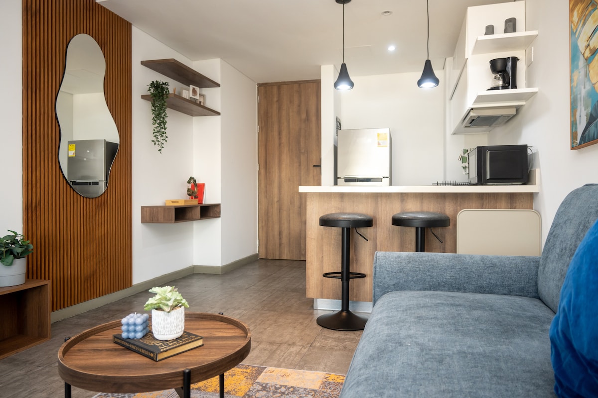 Ein modernes Apartment mit zeitgenössischer Architektur. Es verfügt über eine kleine Terrasse mit einem Schiebedach, ein Zimmer mit einem Kleiderschrank, ein Arbeitszimmer mit einem Doppelbett und zwei Badezimmer. Sichere ruhige Gegend in der Nähe von Parks, Einkaufszentren, Restaurants usw. Parqueadero tagsüber kann da sein, das darfst du nicht. Der Parkplatz am Eingang des Gebäudes, der Wagen bietet Platz für draußen, 3 Meter vom Eingang entfernt.