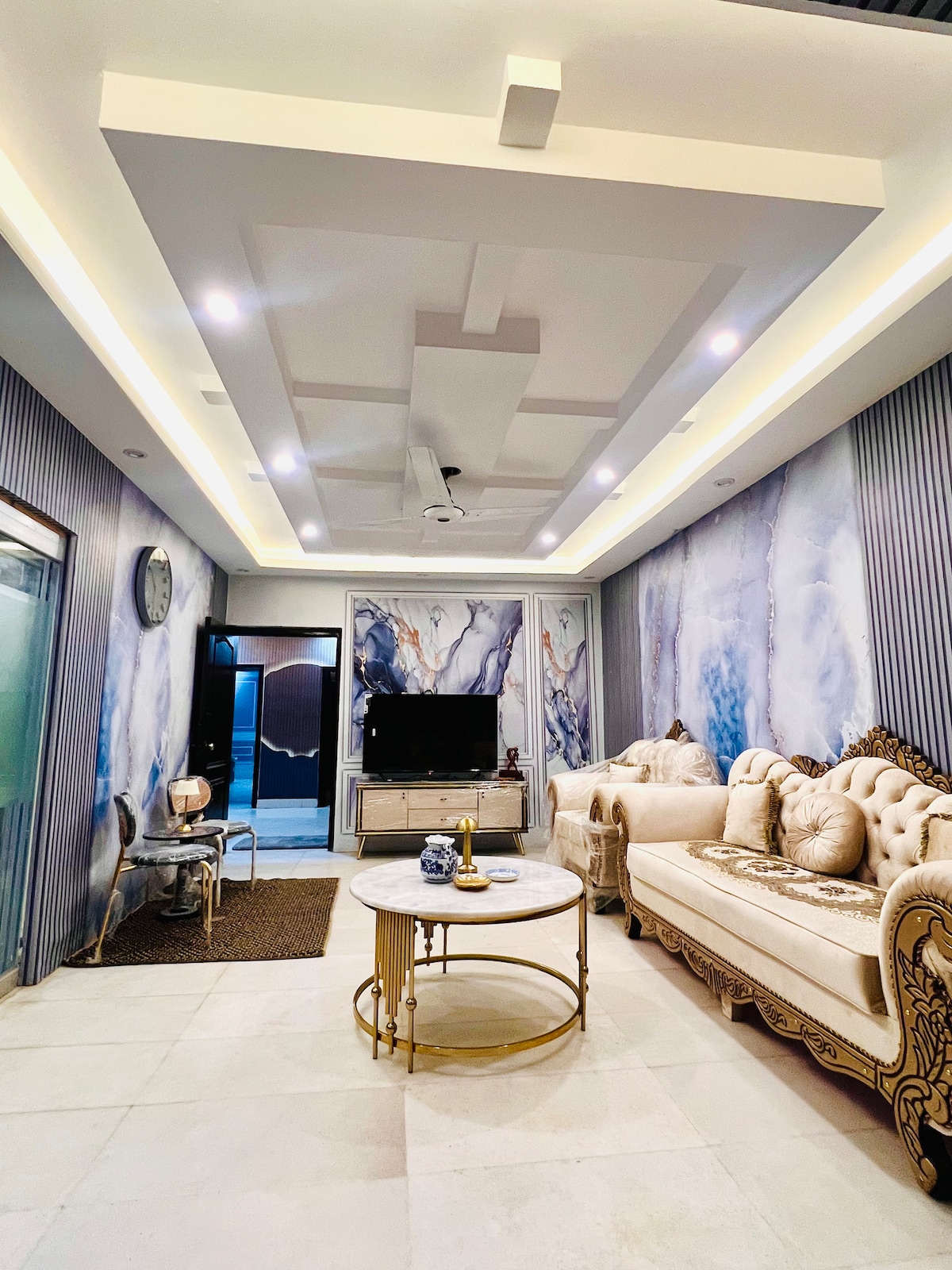 Dieses gesamte Studio-Apartment mit einem Schlafzimmer, einem Wohnzimmer und einer Küche mit Essbereich befindet sich in der DHA Phase VI Small Bukhari im 1. Stock und bietet alles, was du brauchst. Versinke in ein bequemes Queensize-Bett, lausche Musik über das JBL-Soundsystem oder entspanne im Wohnzimmer auf einem Samtsofa. Mit zwei Badezimmern gibt es kein Warten. Koche in der eleganten Küche und genieße deine Mahlzeit dann unter dem Licht der Bogenlampe bei einem atemberaubenden Meistergemälde. Genieße außerdem einen Willkommenskorb, Wasser und kalte Getränke auf uns.