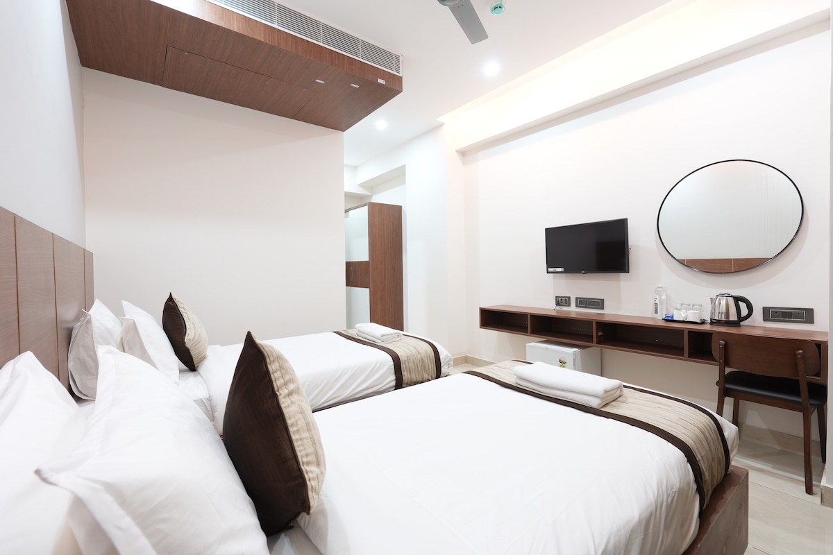 Das Sanctum Suites Indiranagar Bangalore liegt im Stadtzentrum und bietet einfachen Zugang zu beliebten Geschäften und Restaurants. Dieses Studiozimmer verfügt über ein Kingsize-Bett, eine Küchenzeile mit einem Kühlschrank und eine Mikrowelle, was es ideal für einfaches Kochen macht. Unsere einzigartige Unterkunft in der Nähe der U-Bahn-Station Indiranagar bietet auch ein Frühstücksbuffet und kostenlose Parkplätze vor Ort. Die 100 Ft Road ist nur 500 m von unserer Unterkunft entfernt.