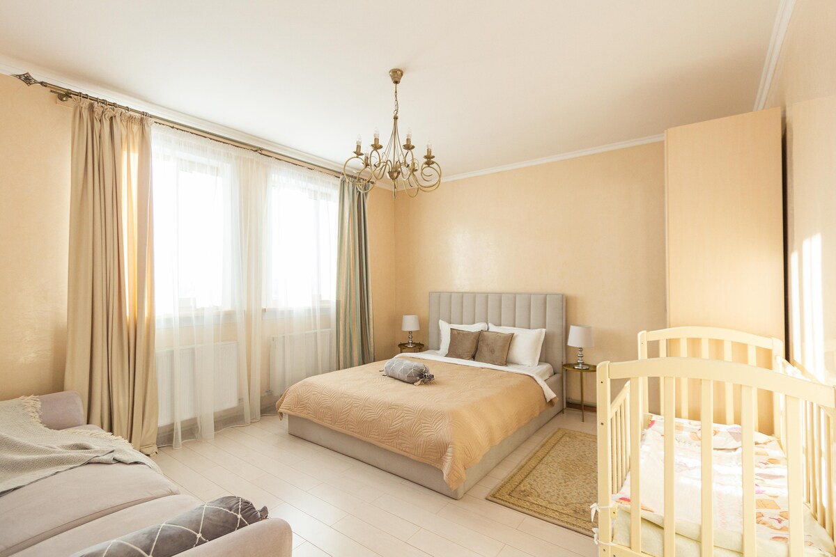 Dies ist eine gemütliche 1-Zimmer-Wohnung in einem Haus der Business-Klasse. Neues Interieur in edlen Blau- und Grüntönen, frische Möbel und Textilien. Jedes Detail ist für deinen Komfort durchdacht. Entwickelt für 4 Pers. Es gibt ein Doppelbett und ein bequemes Klappsofa. Es gibt alles für einen angenehmen Aufenthalt: Bettwäsche, Bademäntel, Tee, WLAN, Smart-TV. Ein großer, geschlossener und sicherer Hof mit Parkplatz und einem Kinderspielplatz. In der Nähe von Cafés, Geschäften, EXPO, Mega Silk Way, IT-Hub. Perfekt für Urlaub und Geschäftsreisen.