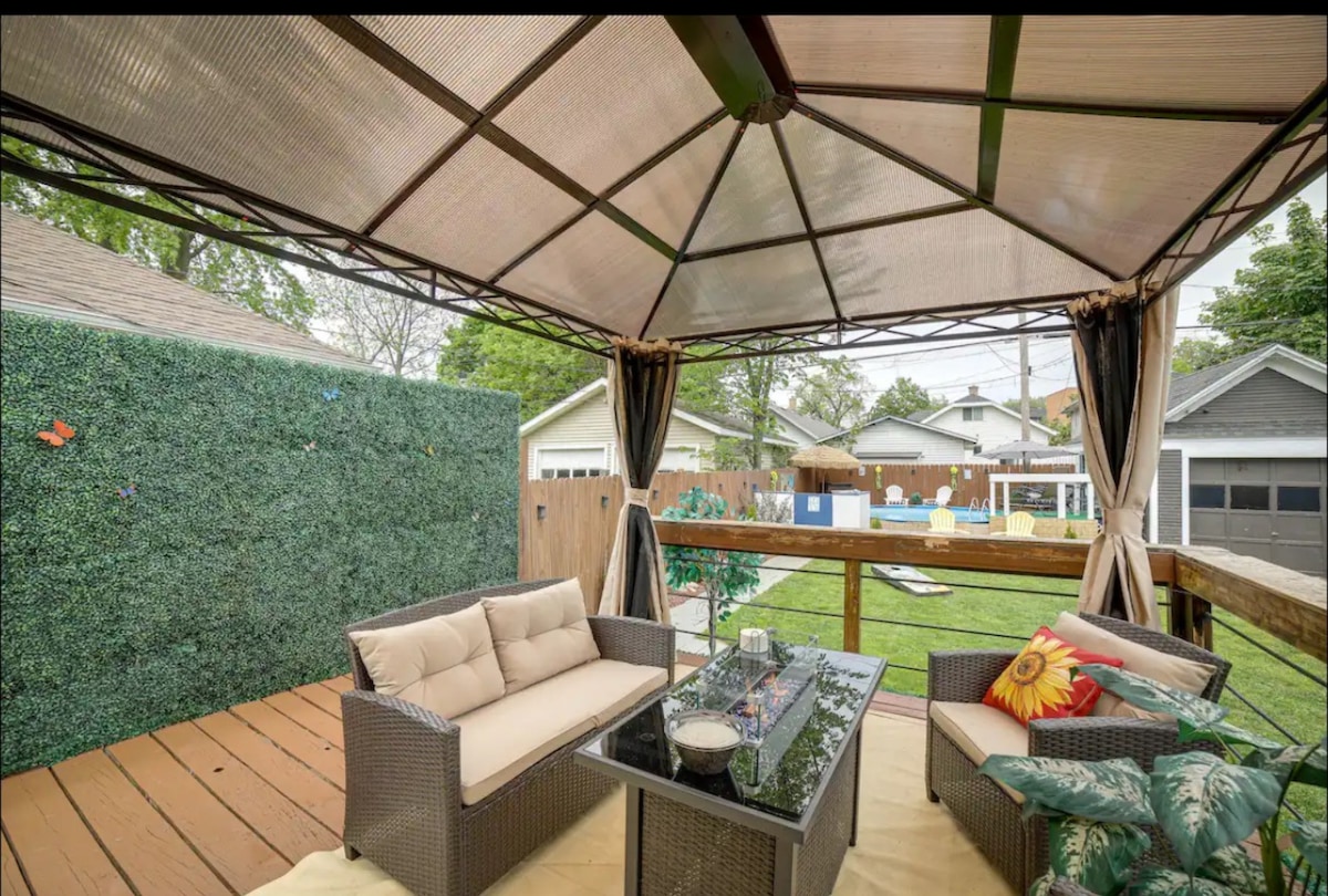 Dieses große Haus auf zwei Ebenen verfügt über 3 Schlafzimmer, 2 Bäder, 2 Wohnbereiche und ein großes offenes Küchen-/Esszimmer, das zur Außenterrasse mit Feuerstelle, einem riesigen Hof, einem beheizten, übergroßen Pool (Mai-September), einem brandneuen Whirlpool und vielem mehr führt. Es hat erstaunliche Annehmlichkeiten, ein Tempur-Pedic-Kingsize-Bett, ein Zero-Gravity-Queensize-Bett, viele Brettspiele. Wir haben alle Koch- und Grillvorräte, die du für die besten Gartenpartys benötigst. 8 Meilen bis Downtown GR (ZOO, Van Andel Arena, Devos performance hall)