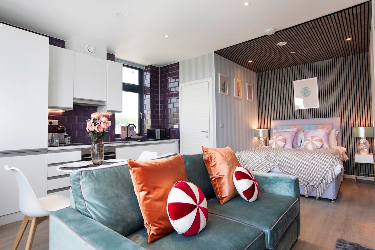 Lehne dich zurück und entspanne dich in dieser gemütlichen, stilvollen und modernen Wohnung am Fluss, die gut ausgestattet ist, um deinen Aufenthalt so angenehm wie zu Hause zu machen. Diese Wohnung mit einem Schlafzimmer verfügt über eine neu eingerichtete Küche und ein Badezimmer, geschmackvoll eingerichtet mit einem Kingsize-Bett und einem privaten Balkon, um einen Blick auf den Fluss Medway zu genießen. Mit nahe gelegenen Annehmlichkeiten in Gehweite wie Asda-Supermarkt nur 2 Minuten entfernt. Der Bahnhof, der dich in 45 Minuten nach London bringt, ist nur 5 Autominuten entfernt. Universitäten und Krankenhäuser befinden sich ebenfalls in der Nähe.