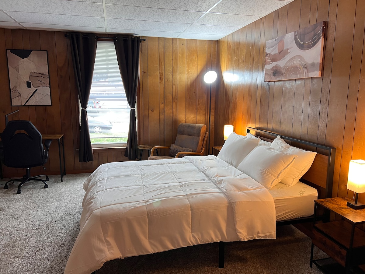 Diese charmante, komplett renovierte Unterkunft mit 2 Schlafzimmern und 2 Badezimmern ist die beste Alternative zu einem Hotel/Motel in dieser Gegend. 1100 Quadratfuß Komfort über dem Hauptgeschoss und dem Schlafzimmer im Dachgeschoss, entworfen mit einfachem und komfortablem Wohnen im Sinn. Die funktionale Küche bietet Snacks und einen offenen Raum zum gemütlichen Wohn-/Esszimmer. Das Wohnzimmer verfügt über ein bequemes Sofa, eine Leseecke (zusätzliche Schlafgelegenheit für ein Kind), einen Fernseher, der alle deine Favoriten streamen kann, und WLAN. Im zweiten Schlafzimmer gibt es auch einen Fernseher.