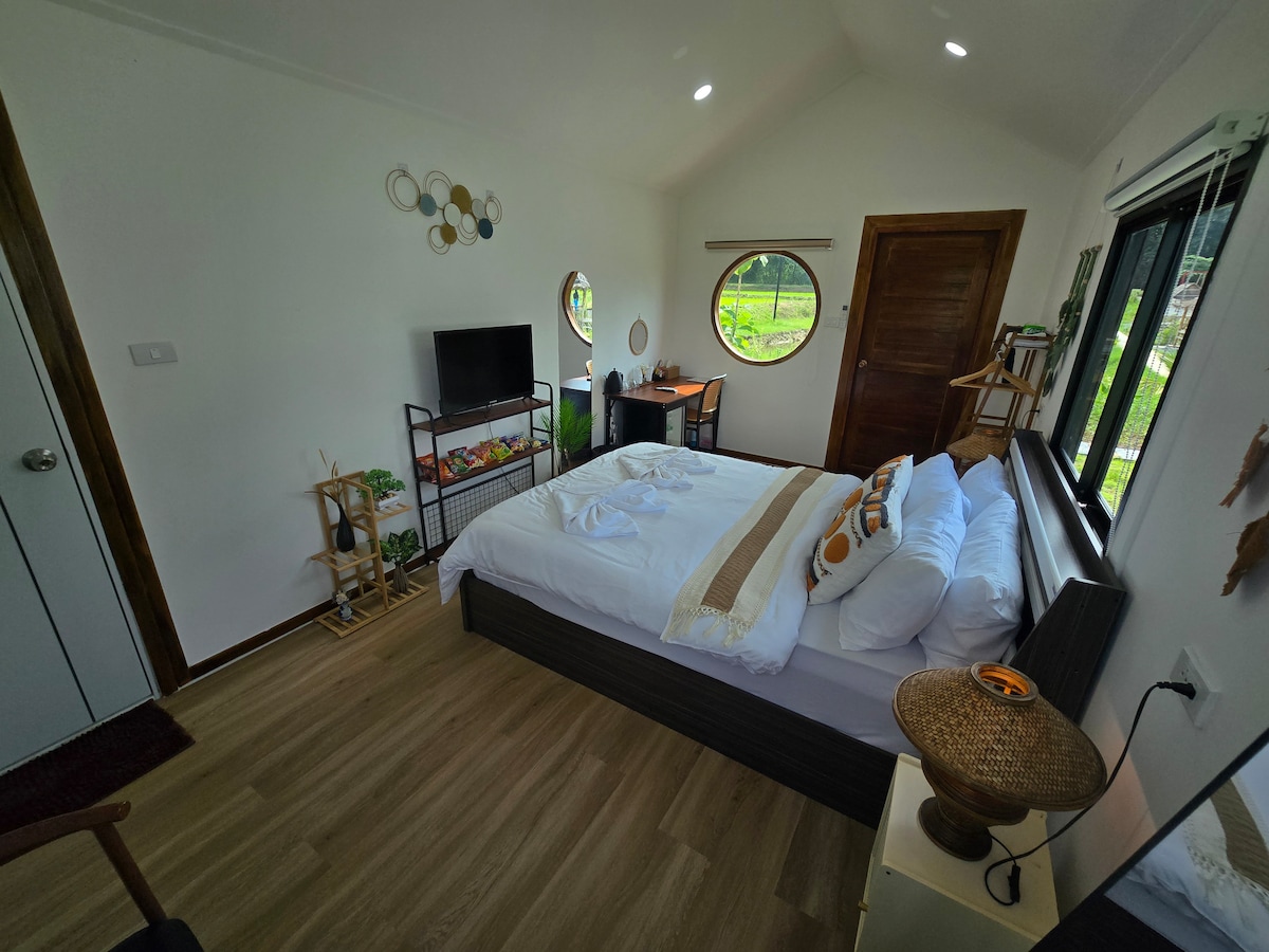 Welcome to our little hidden paradise in the middle of endless rice fields in Nong Ruea district, Khon Kaen province – the real, untouched Isan. Air-conditioned bedroom with queen-size bed, bathroom with rain shower and toiletries, mini-bar, snacks, coffee & tea, Wi-Fi, smart TV with NETFLIX, Private rooftop terrace with 360° views over the rice fields. Shared natural pool (10 m × 35m), café, restaurant-bar & playground on site. Perfect romantic escape in real Isan. Warm welcome by us