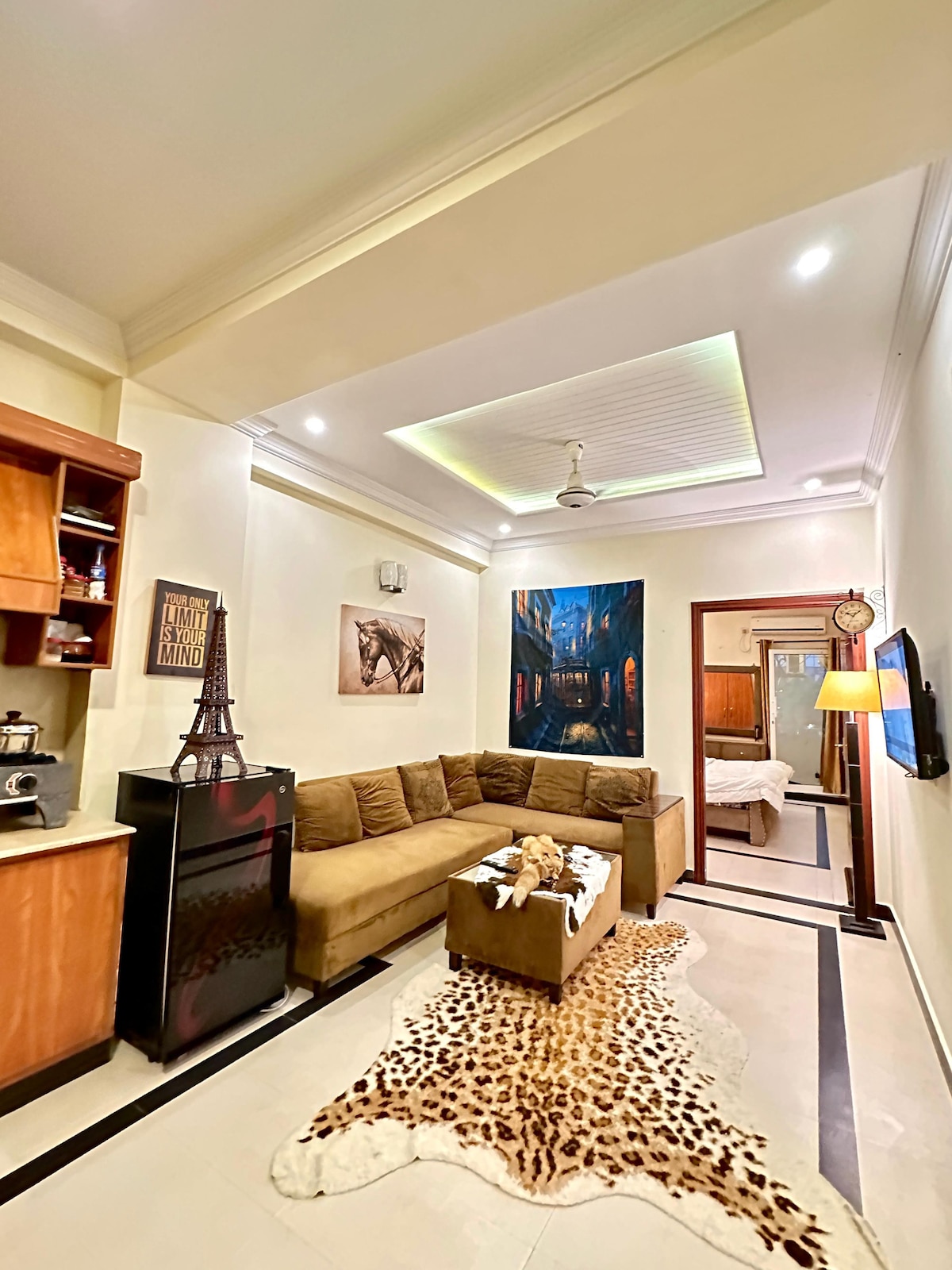 Experience the charm of our homey apartment in Gulberg Greens, perfect for families and young couples. With a cozy bedroom, a well-equipped kitchen, and a welcoming living area, as well as a vibey terrace complete with moody lighting and warm ambience, you'll feel right at home. Located in the heart of the twin cities, the apartment is just minutes away from top attractions like Centaurus Mall and Giga Mall. Ideal for both business and leisure stays, book now for a homey experience in Islamabad!