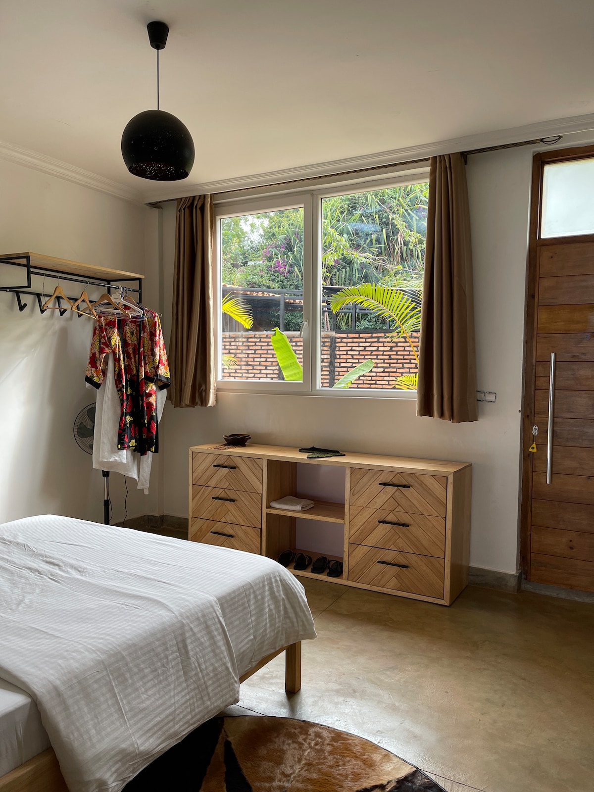 You won’t want to leave this Bohemian Eco-lodge with Stunning Kigali Views! Our Studio Apartment has a living space, bedroom area, kitchen area, bathroom, and a wide balcony outside. The living area is equipped with a large dining table that can be used for work as well. The bedroom area is separated by a wall from the kitchen area which makes everything stay in one place. The balcony is spacious for you to sit and relax and enjoy the view.