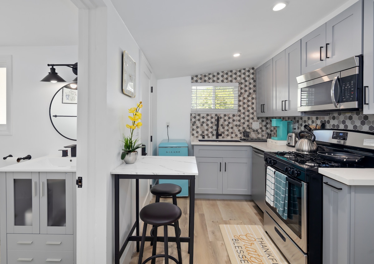 Dieses Haus mit 1 Schlafzimmer/1 Badezimmer ist 15-20 Autominuten vom Dodger Stadium entfernt. In den frühen 1940er Jahren erbaute Einrichtung ist eine Anspielung auf den zeitlosen Charme dieser Ära. Verdunkelungsvorhänge verbessern die Schlafbereiche für erholsamen Schlaf. Die Getränkebar verfügt über reichlich Schränke, eine Akzentwand mit Rückwand und einzigartige offene Lebendigeregale, die aus dem alten Avocadobaum gefertigt sind, der einst die Terrasse geschmückt hat. Die Terrasse wurde seitdem mit Gartenmöbeln umgebaut, was sie perfekt für gemütliche Momente im Freien macht.