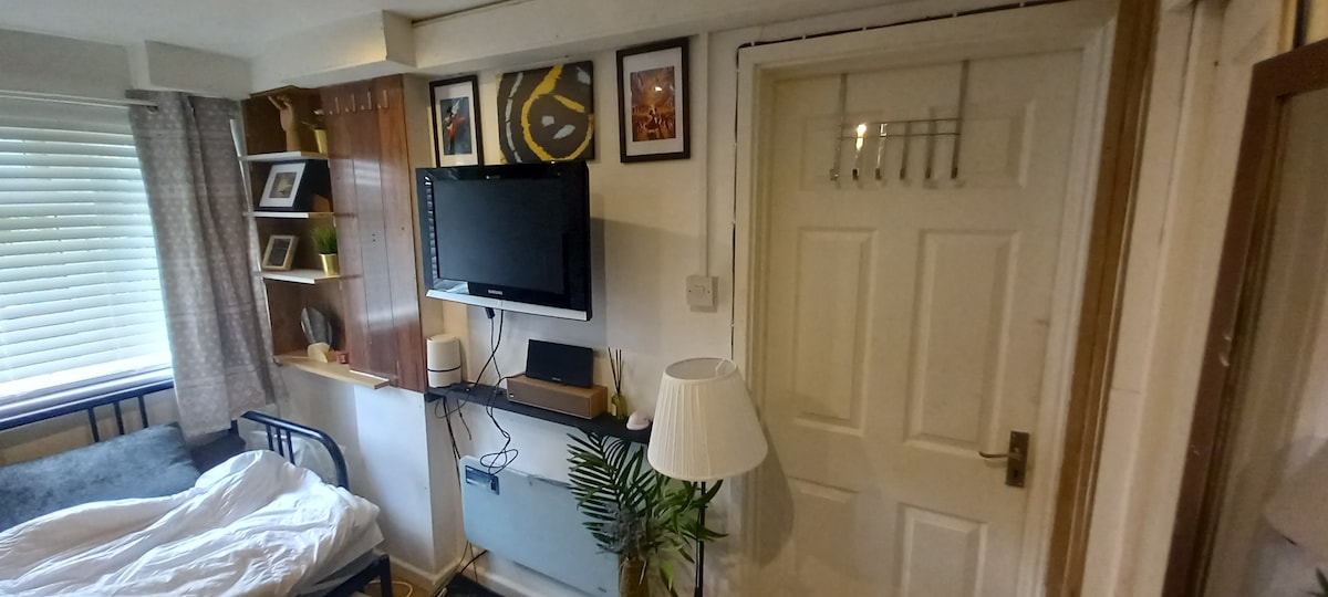 A lovely self-contained studio with patio area and free parking. It contains a king bed, chair & work desk; kitchen with fridge, sink, hob and microwave and all necessary crockery and utensils etc; wardrobe, drawers; bathroom with good size shower; wifi TV and USB sockets; its own central heating and hot water systems and modern decor. Towels, tea-towels, soap, washing up liquid and bed linen provided along with some basic food items such as salt/pepper, teabags, coffee, sugar, squash, etc