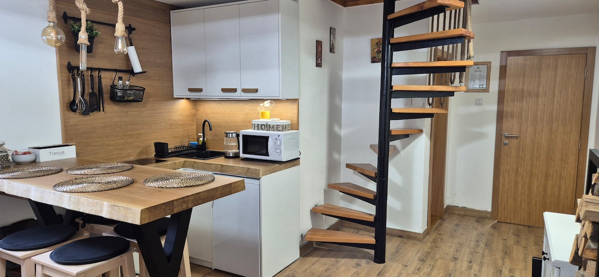 Ausgestattet mit hochwertigen Möbeln für Entspannung und Komfort, verfügt die Cozy Lodge über ein modernes, erhöhtes Kingsize-Bett für außergewöhnlichen Komfort, damit du dich wohl und willkommen fühlst. Die Wohnung verfügt auch über eine Küche mit allen notwendigen Utensilien, einen Kühlschrank, einen Backofen, eine Mikrowelle, einen Herd mit zwei Flammen sowie einen Tisch für Arbeit und Essen. Handtücher, Bettwäsche, ein Föhn, ein Bügeleisen und Toilettenartikel werden bereitgestellt, also mach dir darüber keine Gedanken ☺️ *Spa und Parkplatz sind nicht kostenlos