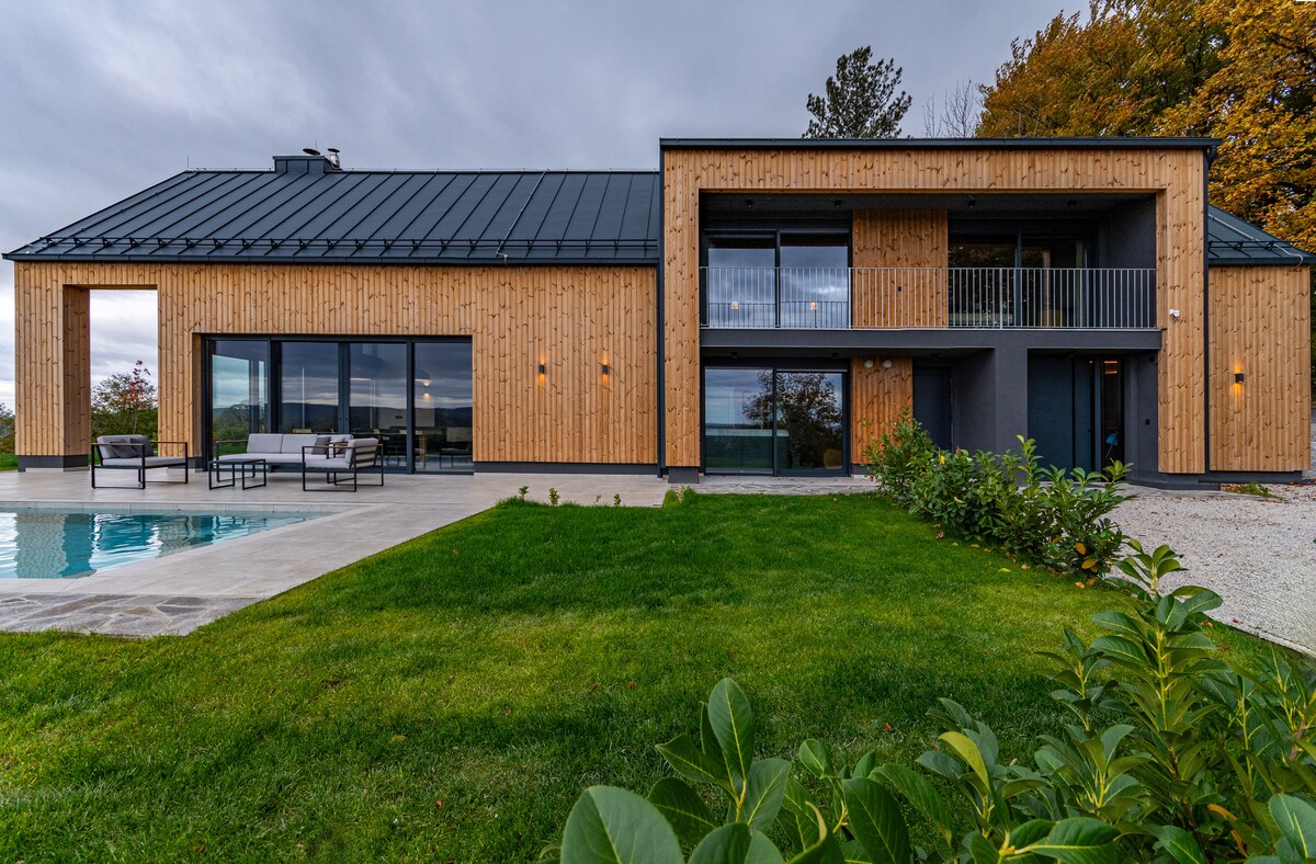 In einer ruhigen Gegend von Kontinental-Kroatien, oben in den Hügeln 15 Minuten von der Stadt Varazdin entfernt, findest du ein kleines Stück Himmel – Villa IVKA. Die Villa wurde 2021 erbaut und befindet sich in einem der ruhigsten Teile Kontinental-Kroatiens. Rustikal moderne Architektur, Glasfronten, die aus dem Haus herausragen, und ein Balkon im zweiten Stock der Villa schaffen eine außergewöhnliche Breite mit einem schönen Blick auf die Natur und der Blick erstreckt sich bis zum Hügel Ivanšćica und Kalnik.
