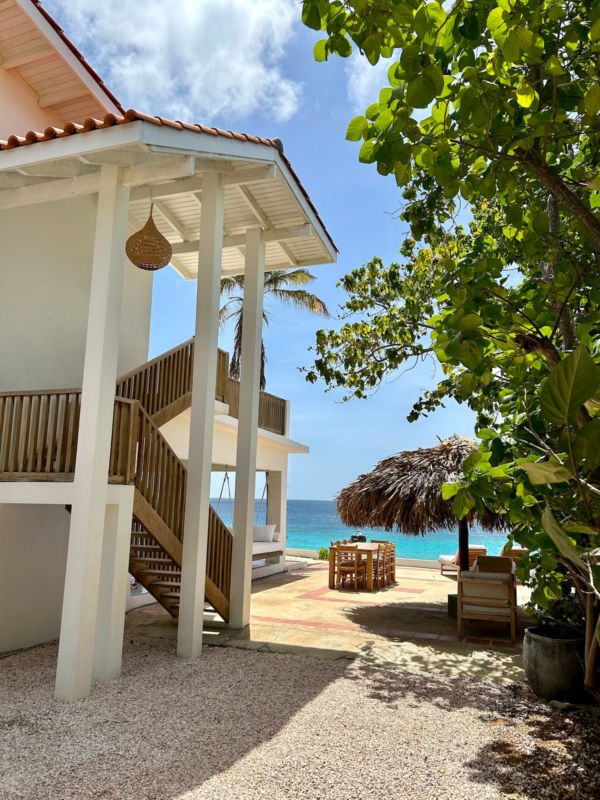 This is the last Beach House going South, 3 miles from the small airport and has thus 270° free views of which 180° ocean view. Next to dive spot 'Hilma Hooker' and 'The Lake', 3 steps from the ocean and good access for snorkling and diving. This is the best spot in Bonaire according to many guests. Nature, close to it all, ocean life and free views is the perfect combination. The house is made of tropical hardwood, coral stone and concrete. It has a fantastic wind through design.