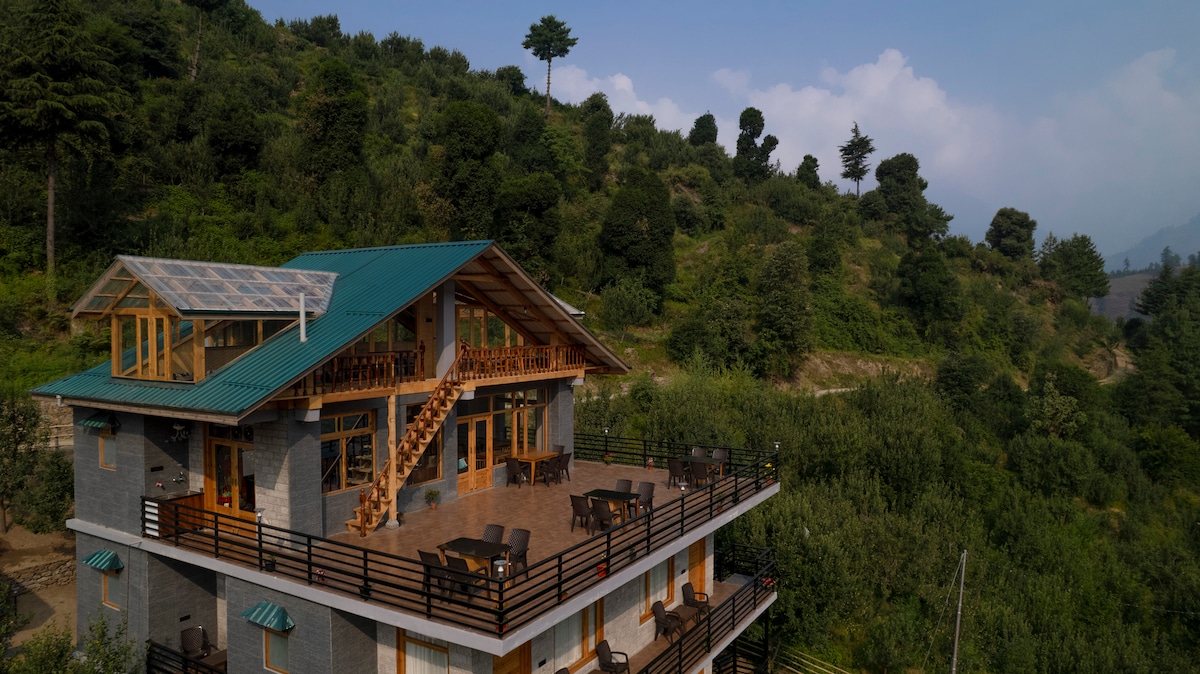 2 private Schlafzimmer mit 2 Badezimmern, jedes Zimmer hat einen Balkon und gemeinsame Terrassensitzgelegenheiten faszinierender Blick auf das Manali-Tal direkt vom Bett aus Eine Terrasse mit Sitzgelegenheiten, auf der du morgens in der Sonne entspannen und abends auf dem Grundstück unter den Sternen feiern kannst