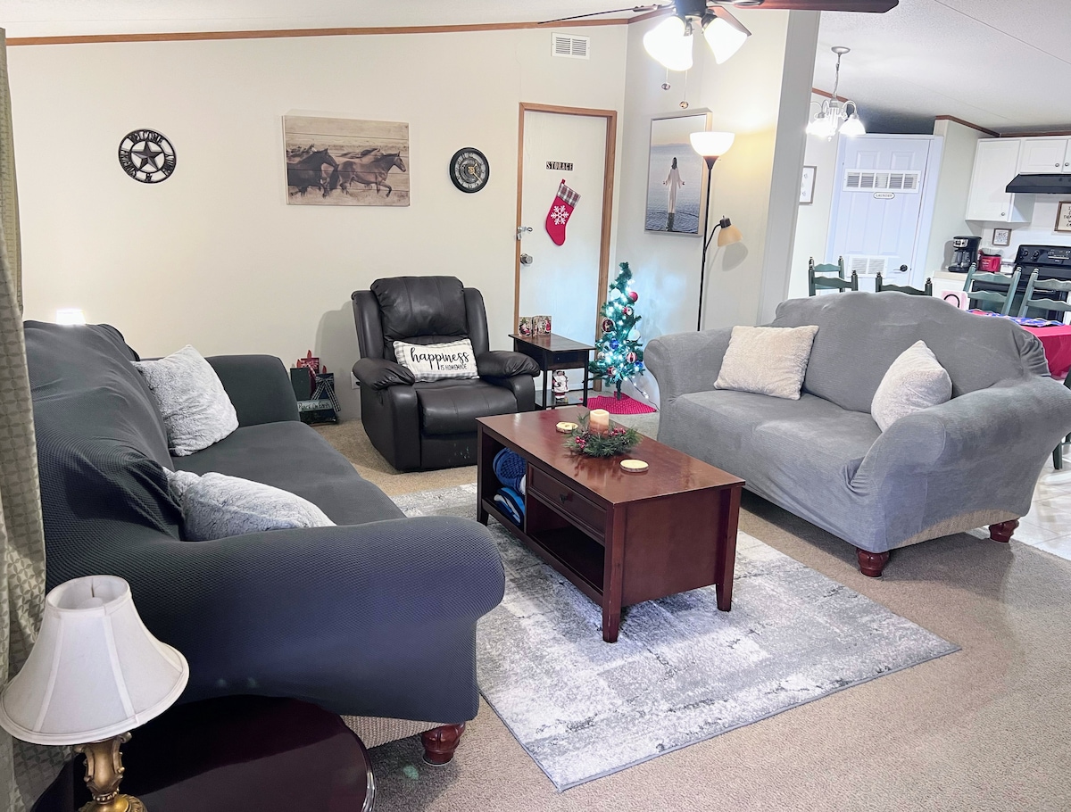 Quaint home in a clean & quiet h.o.a. manufactured home neighborhood. Located 12 minutes from TX State Tubes, 13 miles north of San Marcos Outlet stores & 25 miles north of Comal/Guadalupe River tubing & Schlitterbahn water park. Equipped with household essentials except an iron due to previous burned carpet damage. 2 bedroom queen bed each, suitable for 4 adults 2 per room, & two vehicles. It’s a great alternative to staying in hotel. For less money you can have an entire house to yourself!