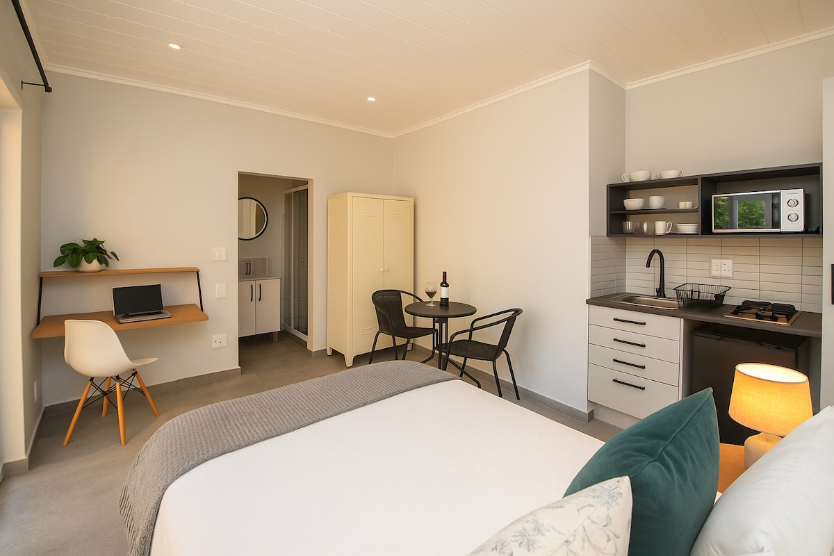 Relax in this stylish, modern, solar-powered loft in Mostertsdrift, Stellenbosch's prime neighbourhood. The open-plan kitchen, cozy living area, and private balcony with stunning mountain views to enjoy your morning coffee or a glass of wine, is perfect for up to three guests. Just a short walk from Lanzerac Wine Estate and close to cafes, shops, and dining spots. Enjoy scenic hikes or mountain biking in Jonkershoek Nature Reserve, wine tasting, or simply unwind—everything is at your doorstep!