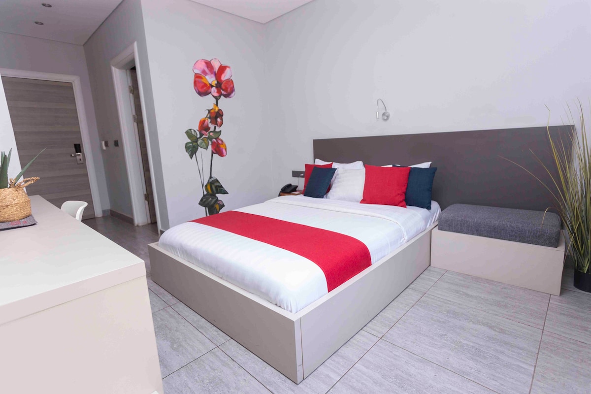 Genieße den Glamour dieser stilvollen, gehobenen Unterkunft. 5 Fahrminuten vom Flughafen und 3 Fahrminuten von der Accra Mall entfernt. Erstklassige Lage im Herzen von Accra - Glasfaser-WLAN - Business Ultra DSTV - Frühstück vor Ort - Smart TV+ Apple Airplay Brettspiele - Bücher - Fitnessstudio - Wachdienst und Rezeption rund um die Uhr - Schwimmbad - Generator verfügbar - Wassertanks - Ruhige Umgebung - Parkzone - Reinigungsdienst - Wäscheservice - Geeignet für einen Langzeitaufenthalt