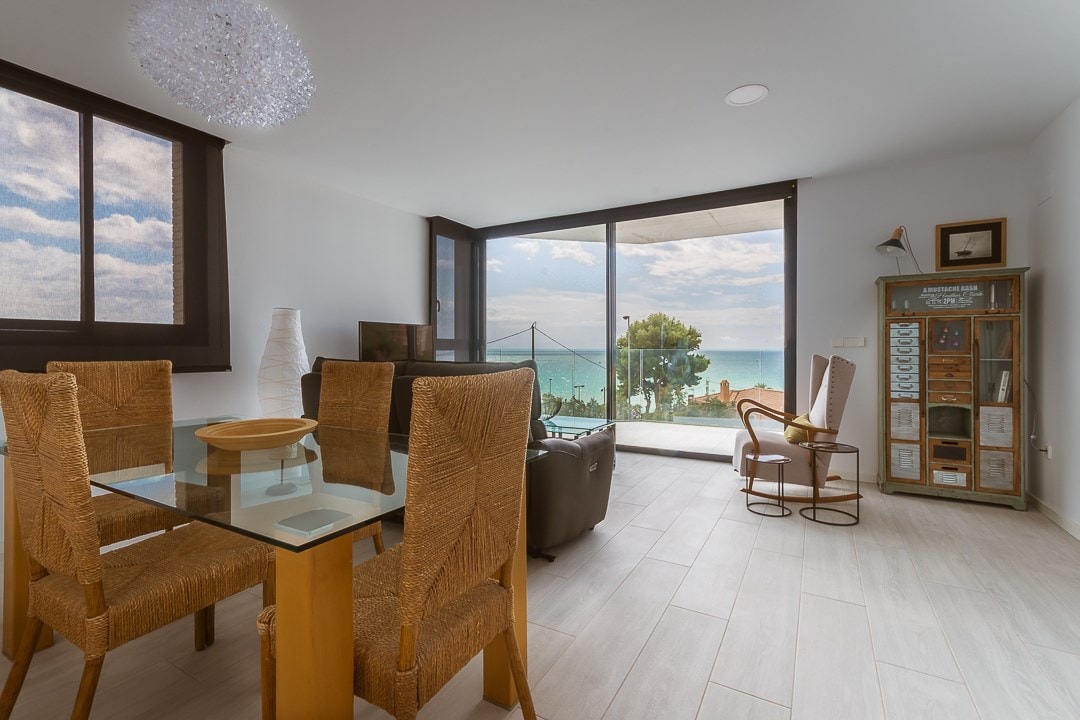 Spektakuläre 120 Meter am Strand, kürzlich renoviert mit Esszimmer, das in eine 60 Meter lange Terrasse umgewandelt werden kann, atemberaubendem Blick auf das Meer und die Küste und einem Chill-out-Entspannungsbereich. Designerküche und 2 Badezimmer. Alle außen, 3 sehr geräumige Doppelzimmer. Umkehrosmose-Wasserreiniger. Direkter Zugang zum Strand von der Urbanisation. Neu gebautes Schwimmbad. Kostenlose Parkplätze. Bereit für Kinder! Lizenz VT-463132-A