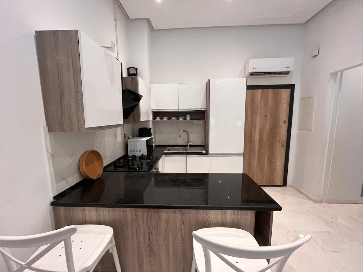 Komfortable und geräumige Wohnung mit einem Schlafzimmer im Herzen von La Marsa, 50 m vom Strand entfernt. Die Wohnung ist unabhängig. Verfügt über ein Wohnzimmer, ein großes Schlafzimmer (mit einem Queensize-Bett), einen Balkon, eine gut ausgestattete Küche und ein Badezimmer mit Dusche. Die Wohnung ist voll ausgestattet: - Klimaanlage/elektrische Heizung -Kühlschrank -Mikrowelle -Gas -Internet - Fernseher mit Apple-TV -Waschmaschine -Kaffeemaschine - Toaster - Haarföhn -Bügeleisen