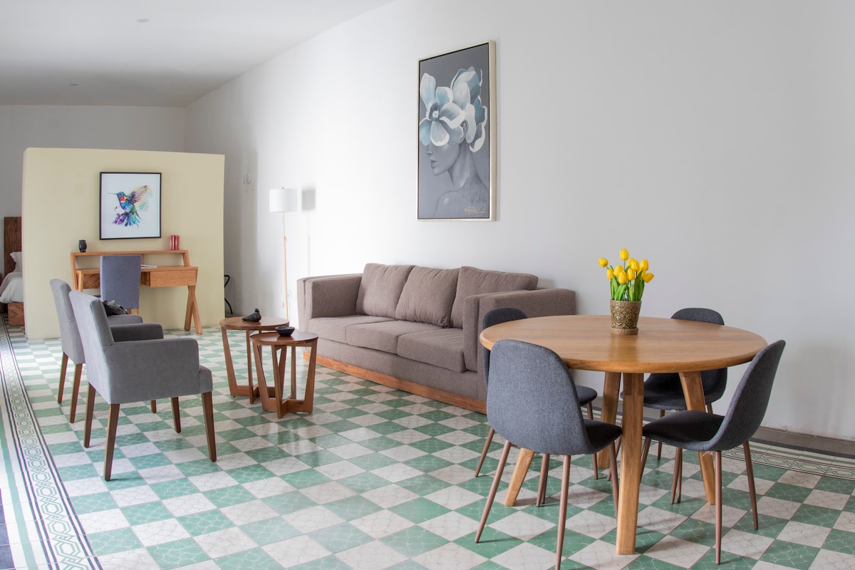 Komm und übernachte in einem 125 Jahre alten Patrizierhaus in Guadalajara Centro Historico. Neue Executive-Wohnung, perfekt für Langzeitaufenthalte. Vier Blocks vom Zentrum des Geschehens entfernt. Gewinner des 15. jährlichen Preises für die Erhaltung und Restaurierung von Gebäuden von patrimonialem Wert. Mit viel Licht. Wir nutzen grüne Energie. Drei 120-Mbit/s-WLAN-Dienste.