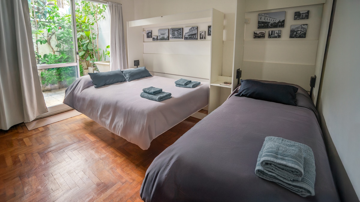 PH de un dormitorio con una cama doble y una simple con jardín privado. Ubicación céntrica pero pacífica. Baño completo y cocina comedor con utensilios y blanquería incluida. Acceso independiente por luminoso patio lleno de vegetación. Cerraduras con trabas en todas las puertas. Amplios guardados. TV por cable, WI FI, caja fuerte, equipos de música Ideal para parejas y viajeros de negocios o estudio y personas c/ movilidad reducida.
