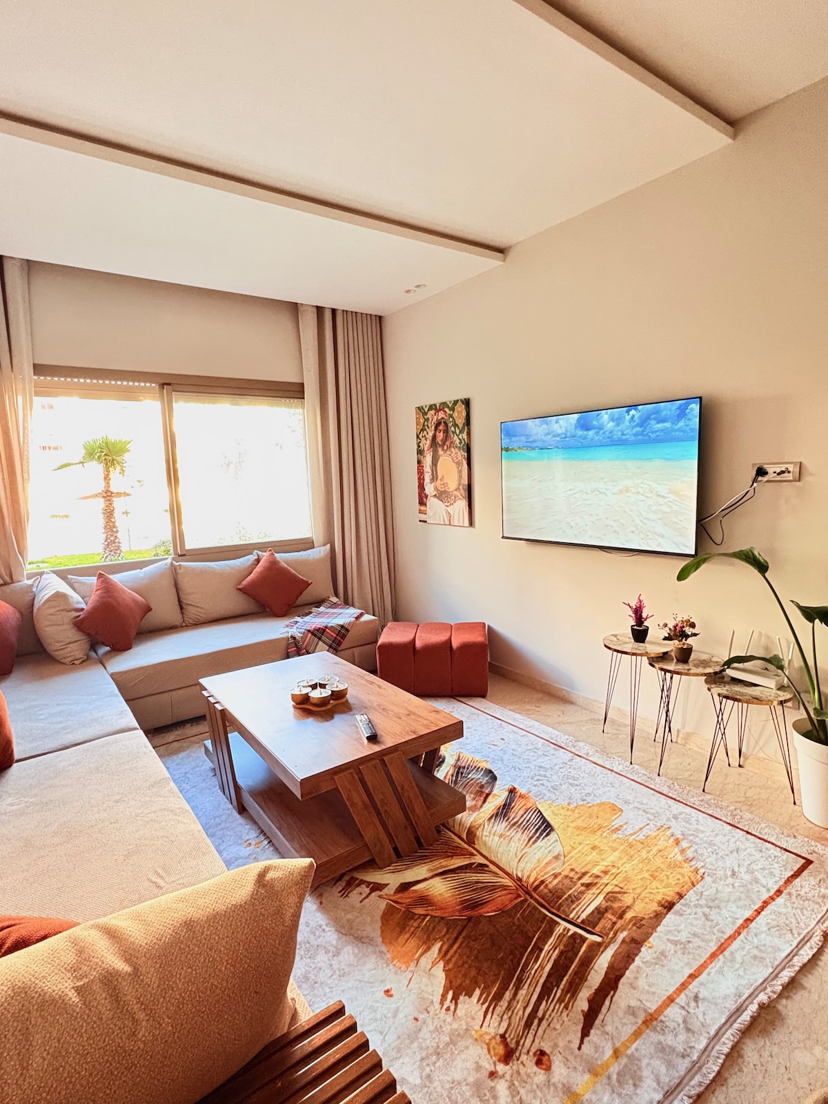 Wunderschöne 2-Zimmer-Wohnung in der Nähe des Flughafens Mohammed V Entfliehen Sie in unsere gemütliche 70 Quadratmeter große Wohnung im Herzen von Deroua, nur wenige Minuten vom Flughafen Mohammed V. Im ersten Stock eines sicheren Gebäudes der TISSIR-Siedlung gelegen, bietet unsere Wohnung eine perfekte Mischung aus Bequemlichkeit und Ruhe. Diese Familienunterkunft liegt in der Nähe aller Sehenswürdigkeiten und Annehmlichkeiten.