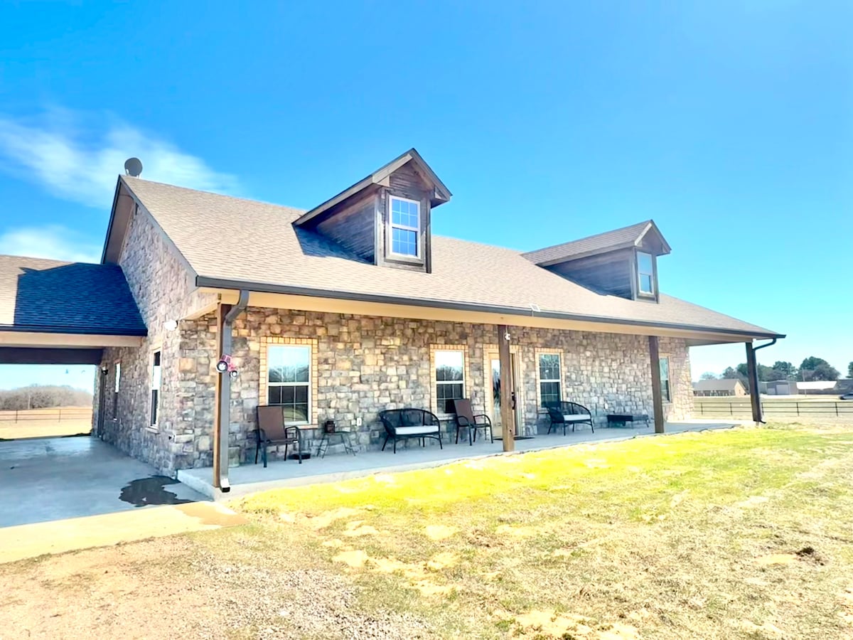 Umgestaltetes Haus mit 78 privaten Hektar, einschließlich eines privaten Sees. Perfekt für Familienurlaube. Etagenzimmer, Kingsize- und Queensize-Betten. Genieße die Natur - Wildtiere, Feuerstelle und Grill. 1,5 Meilen private Wanderwege auf dem Grundstück. 5 Minuten zum Lake Murray State Park - Wandern, Golf und Wassersport. Eingezäunt um das Haus für Haustiere. Großer Tornado-Schutz. WLAN wurde kürzlich auf 200 Mbit/s. Genieße die Natur – 1,5 Meilen Wanderweg rund um das Grundstück, Angeln, Feuerstelle im Freien, überdachte Außenterrasse mit großem Gasgrill.