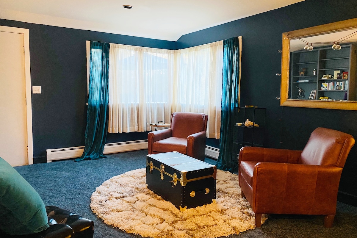Dieser lichtdurchflutete Raum befindet sich in einem separaten Flügel meines Hauses mit eigenem privaten Eingang. Es gibt ein Schlafzimmer mit einem Kingsize-Bett, ein geräumiges Wohnzimmer mit Tisch für Mahlzeiten, einen großen Fernseher, einen Kühlschrank mit Gefrierfach, der mit Wasser in Flaschen und 1/2&1/2 für Kaffee gefüllt ist, eine Mikrowelle und eine Kaffeemaschine mit Kaffeepads sind vorhanden. Du wirst den Zug hören, wenn er durch die Stadt fährt. Es gibt mehrere Restaurants in der Nähe. Schau dir unbedingt den REISEFÜHRER in meinem Inserat an, um zu sehen, was unsere Gegend bietet!!!
