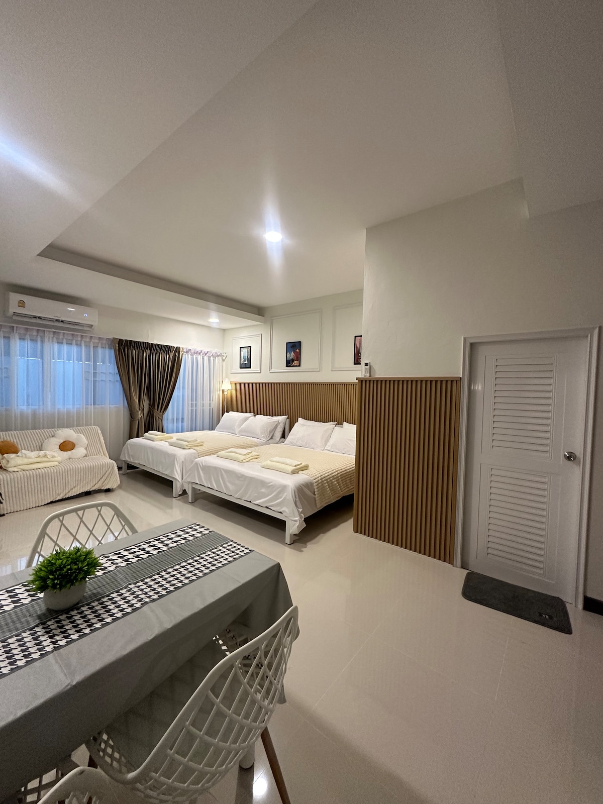 Spacious 2-bedroom apartment on the 4th floor, each with its own ensuite bathroom plus a cozy living room to relax in. Please note there is no elevator—stairs are required to access the unit. Perfect for families, friends, or business travelers seeking comfort and privacy near Suvarnabhumi airport(BKK)