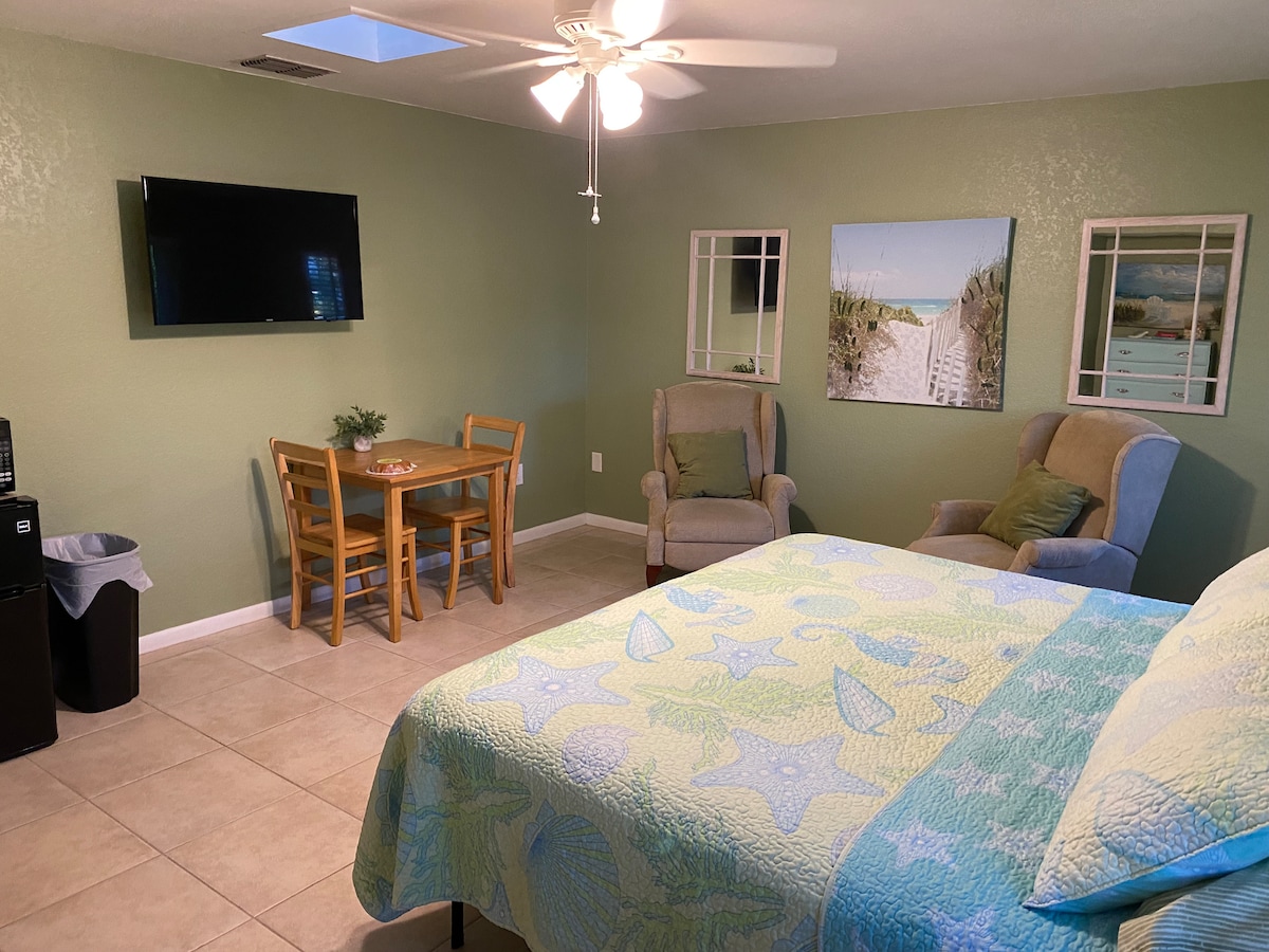 Diese Gästesuite ist eine große Studio-Wohnung (360 Quadratfuß), die an unser Haus angeschlossen ist. Sie verfügt über einen privaten Eingang, ein großes Bad, ein großes Schlafzimmer mit Poolblick und eine private Terrasse. Sie verfügt auch über eine Küchenzeile mit großem Kühlschrank, Toaster, Kaffeemaschine und Mikrowelle. Kein Herd. Kostenlose Frühstücks-Snacks inklusive Kaffee, Tee und Kekse. Entspanne dich auf der Terrasse und beobachte die Vögel auf der Vogelfutterstelle oder schnappe dir unsere Fahrräder, Liegestühle und gehe zum Strand. Grill vorhanden. Bitte lies die Hausregeln vor der Buchung.
