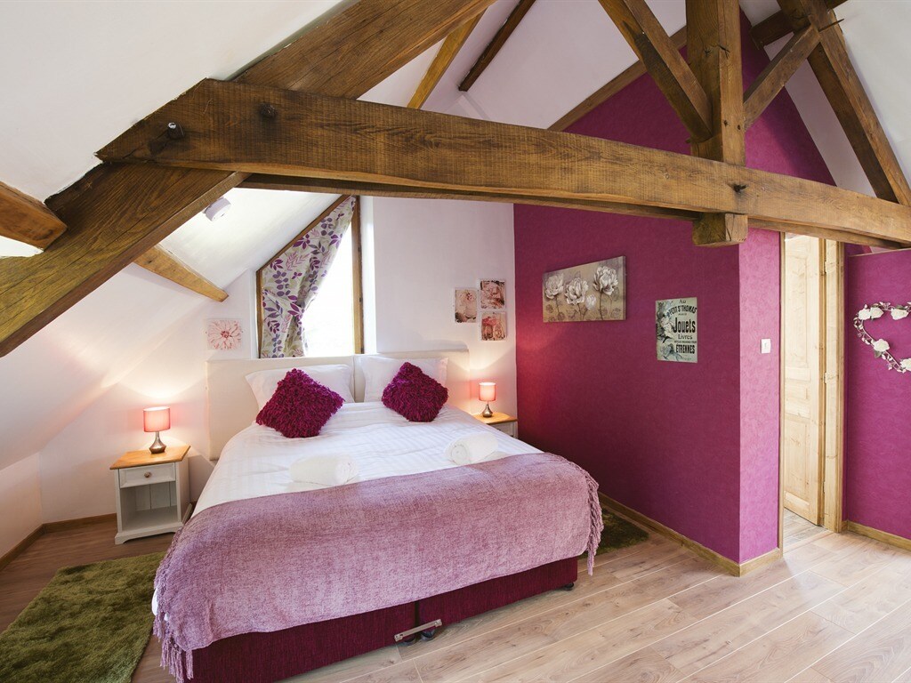 Chambre très spatieuse entièrement redécorée par sa propriétaire. Vous y trouverez un lit central de 140x190, un grand bureau à droite avec un grand velux donnant sur le jardin et la vallée verte. Un coin salon avec fauteuil et une bouilloire pour déguster thé ou café. Sans oublier un dressing, une entrée, bibliothèque et une grande salle de bain privative.