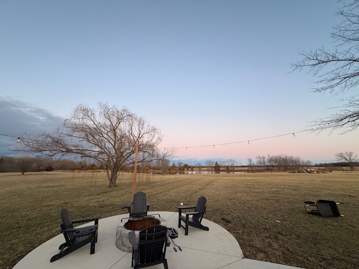 Unser Country House ist ideal für Familienspaß, Kansas Speedway-Fans, KU & KC-Besucher oder einfach nur für einen privaten Kurzurlaub! Die Gäste haben die gesamte untere Ebene für sich allein und können nur den Hintereingang, den Swimmingpool und den Hinterhof nutzen! Wir wohnen auf der oberen Ebene mit unserem eigenen privaten Eingang vorne. Vollständige Privatsphäre! Wenn du nicht gerade Sport treibst, isst und einkaufst, kannst du dich in der Ruhe unserer 26 Hektar entspannen.