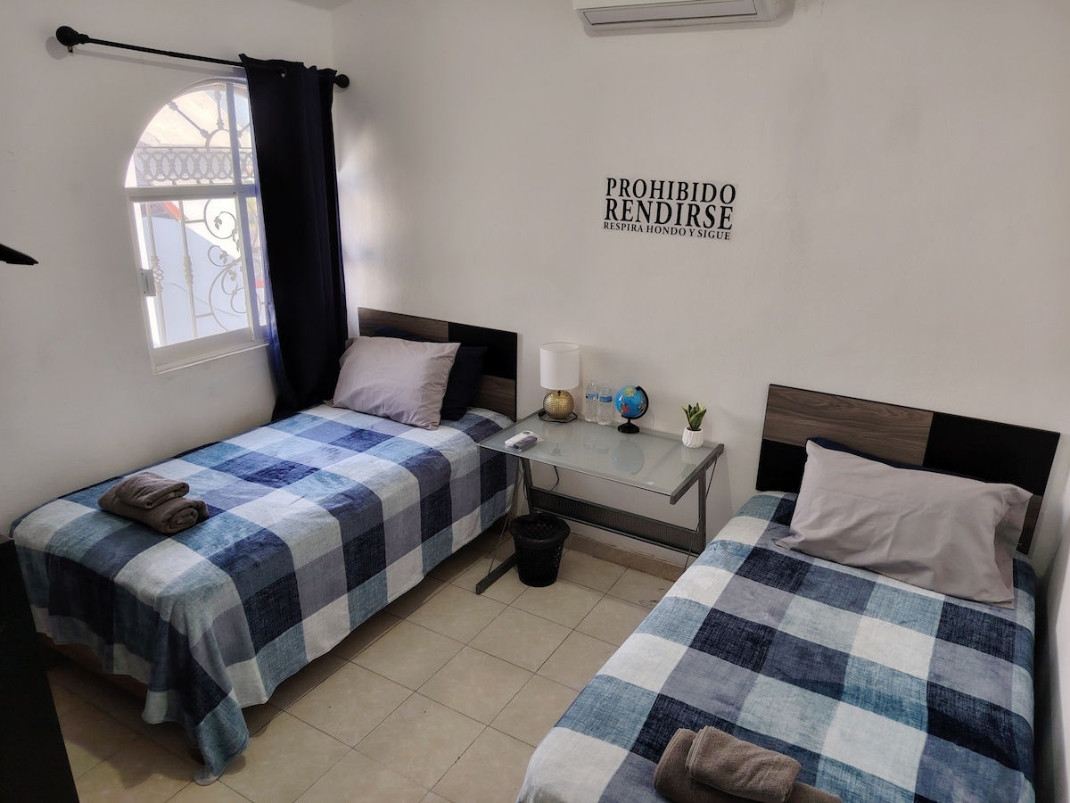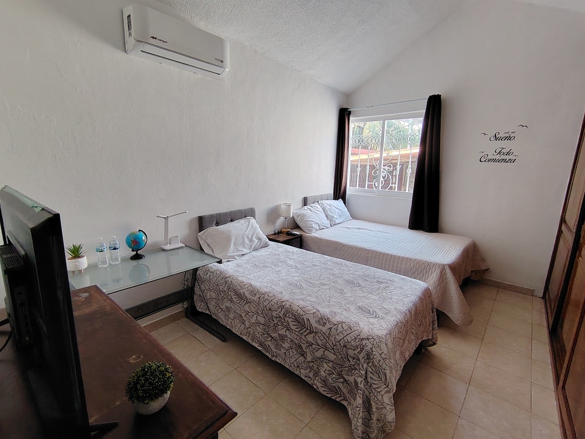 - Zentrales, geräumiges und komfortables Zimmer mit Klimaanlage, Matratze und „Memory Foam“-Kissen, die sich Ihrem Körper anpassen. „Sie werden auf Wolke sieben schlafen“. - Privates Badezimmer, geräumig und makellos. - WLAN, Smart-TV mit Netflix, Schreibtisch, Kleiderschrank usw. - Kostenlose Parkplätze innerhalb oder außerhalb des Hauses. - Gute Lage!: Stadtzentrum (3 Min.), Hafen (8 Min.), Strand (10 Min.), Sportanlage (1 Min.), Bodega Aurrera (3 Min.), Clubs/Bars (5 Min.). **Mit dem Auto.
