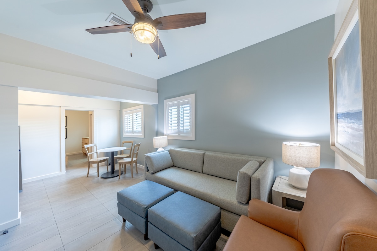 NEUES ANWESEN! Latitude 26 Waterfront Boutique Resort - Fort Myers Beach bietet KOSTENLOSES kontinentales Frühstück, Kajaks, Paddelbretter und Fahrräder! Unser Garden View 2 Queen Kitchenette Studio ist stilvoll mit Stranddekoration eingerichtet und verfügt über einen 40-Zoll-Fernseher mit Streaming-Live-TV/-Filmen. Spaziere zu unserem üppigen Gartenbereich und spaziere durch unsere Uferpromenade. Seekühe und Delfine besuchen oft unseren Yachthafen. Unser beheizter Pool ist groß und verfügt über mehrere Cabanas, um den Tag zu entspannen!