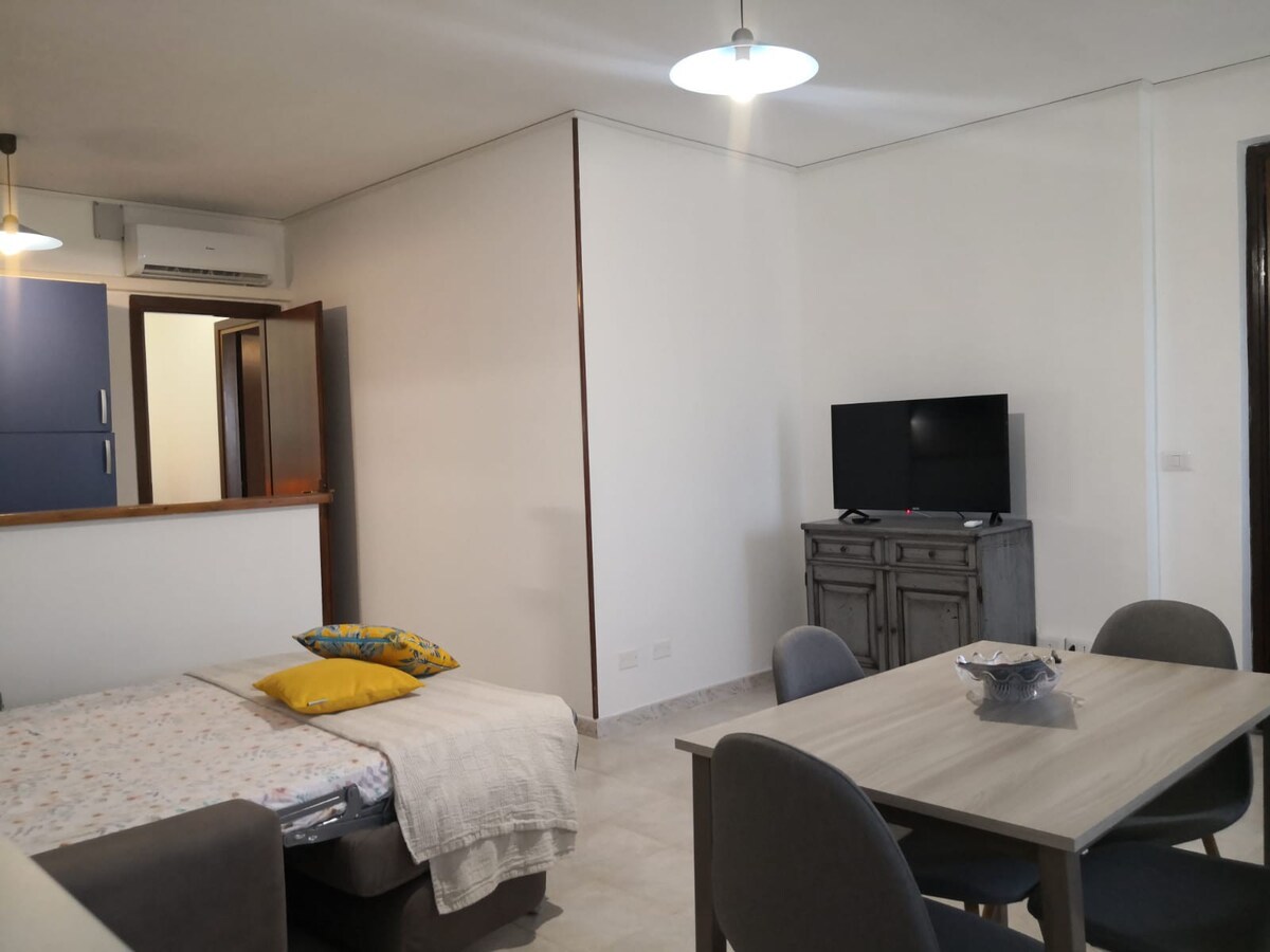 kleine Wohnung im Erdgeschoss, mit Klimaanlage, WLAN, einem Wohnbereich mit einem Schlafsofa und einem Esstisch für 6 Personen, einem Flurbereich, der als Küchenzeile mit Küche, Backofen, Kühlschrank und allem, was Sie brauchen, ausgestattet ist, einem Schlafzimmer mit Doppelbett, einem Badezimmer mit Dusche, Waschmaschine, Haartrockner, Bügeleisen, Pflegeprodukten; im Außenbereich gibt es einen Grill, und vom hinteren Eingang aus haben Sie auch Zugang zu einem Holzofen und natürlich zu einem Parkplatz.