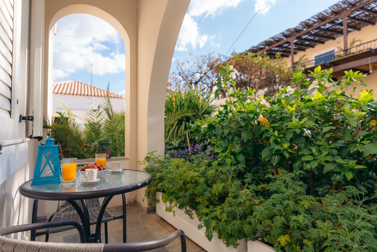 Doppelzimmer-Wohnung mit eigenem Bad und privater Veranda. Teil eines alten Herrenhauses aus dem 18. Jahrhundert. Kürzlich renoviert, damit es bequem zwei Personen beherbergen kann. Im Zentrum der Insel Spetses. Fünf Minuten zu Fuß vom Haupthafen aus erreichbar. Fünf Gehminuten von den meisten Sehenswürdigkeiten (Hauptmarkt, Restaurants, Bars, Museen, Agios Mamas Beach) entfernt.