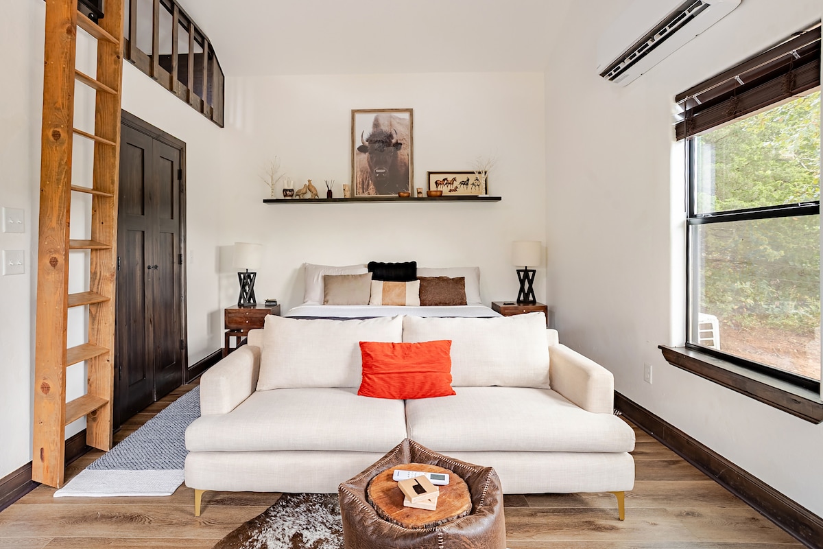 Eingebettet in die malerischen Landschaften einer weitläufigen Ranch strahlt diese Hütte mit einem Schlafzimmer einen rustikalen, schicken Charme aus. Die gemütliche Oase bietet einen perfekten Rückzugsort von der Hektik des Alltags. Das Interieur ist mit gealtertem, wiederverwertetem Holz, warmen Erdtönen und geschmackvollem Vintage-Dekor geschmückt, was ein einladendes Ambiente schafft. Von der Veranda der Hütte aus können Gäste wunderschöne Weiden, einen ruhigen Teich und den majestätischen Baldachin mit hoch aufragenden Bäumen bewundern. Spaziergang mit privaten Wanderwegen.