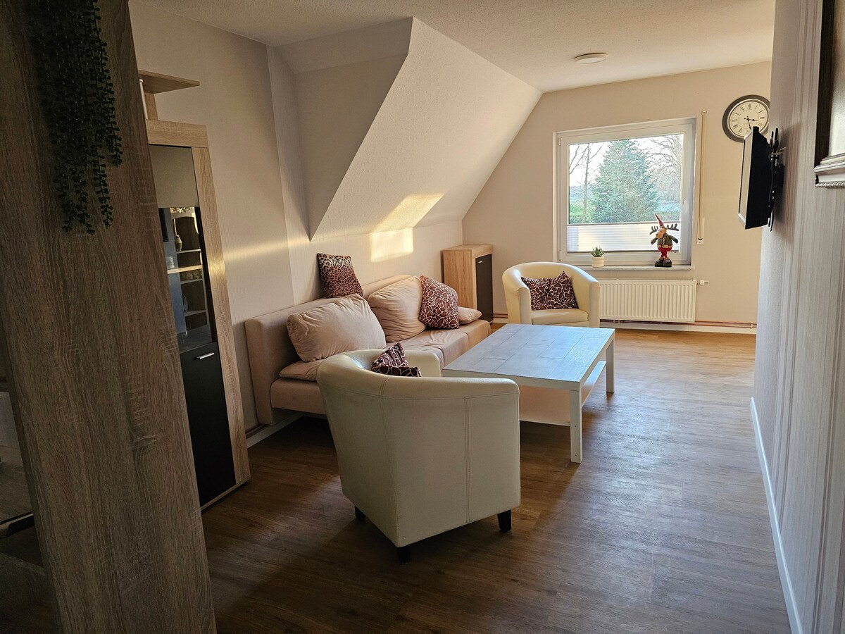 Diese gemütlich Dachwohnung ist sehr liebevoll und geschmackvoll eingerichtet. Sie befindet sich in einer ruhigen Wohnsiedlung über einer Garage im schönen Lastrup und hat einen eigenen Eingang. Sie verfügt über ein schönes, helles Badezimmer mit Badewanne, Waschtisch und WC. Nur eine Straße weiter befindet sich das Naturschwimmbad mit Hallenbad. Der schöne Dorfpark mit See sowie Restaurants, Einkaufsmöglichkeiten, Apotheken, Ärzte, Friseur etc. sind in nur wenigen Gehminuten erreichbar.