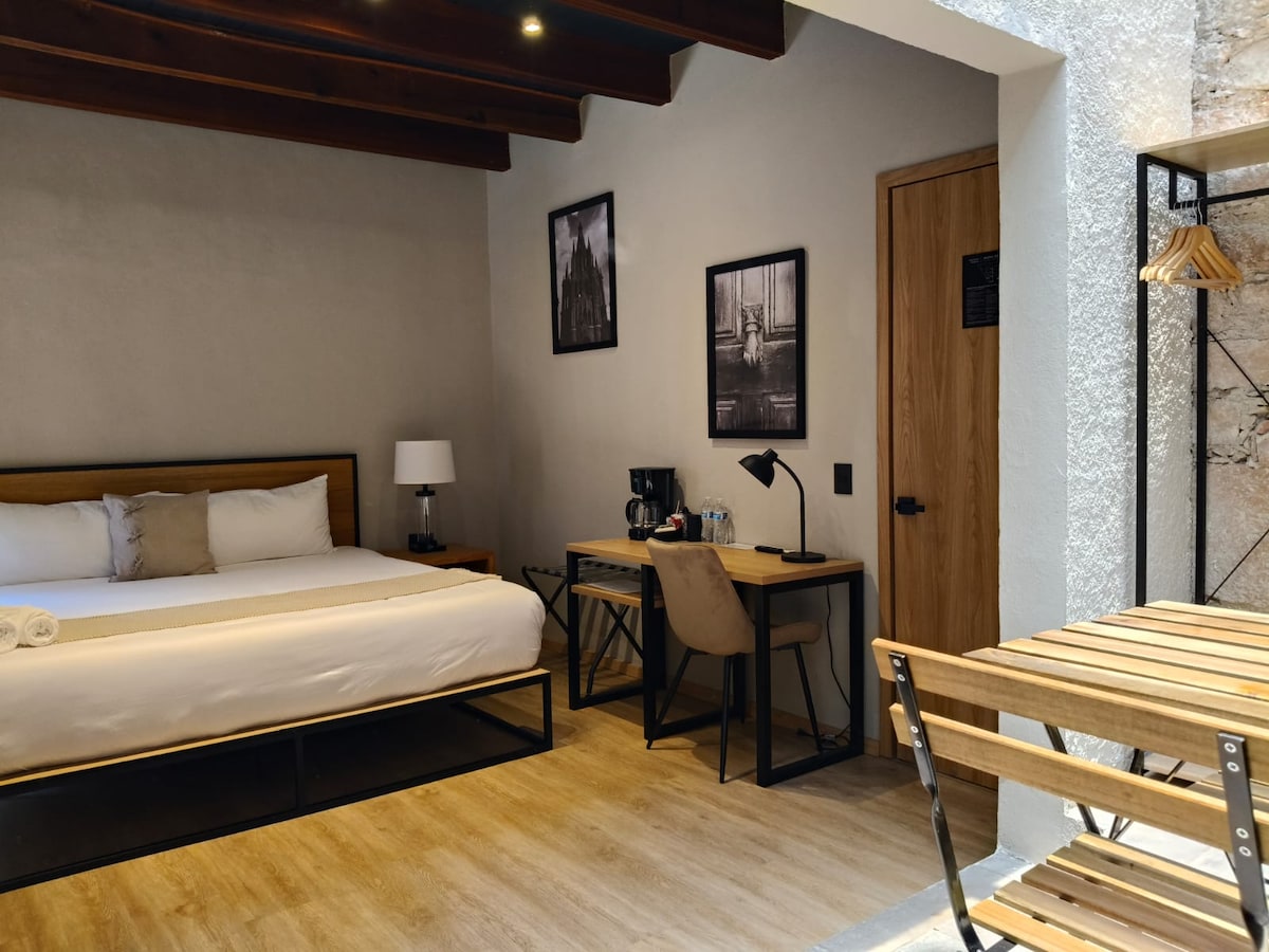 Casa Dos Cuervos in der Innenstadt von Querétaro. Genieße ein einzigartiges Erlebnis in unserer Suite, die von einem Innenarchitektur-Studio entworfen wurde. Sie verfügt über ein Kingsize-Bett, Klimaanlage, eine ausgestattete Küchenzeile und ein unabhängiges Badezimmer. Im Obergeschoss findest du eine geräumige Suite mit Kingsize-Bett, Klimaanlage, TV und Homeoffice-Bereich vor. Immer sauber und bereit, dich willkommen zu heißen. Erlebe die Stadt Querétaro wie ein Einheimischer in einem exklusiven und komfortablen Raum.