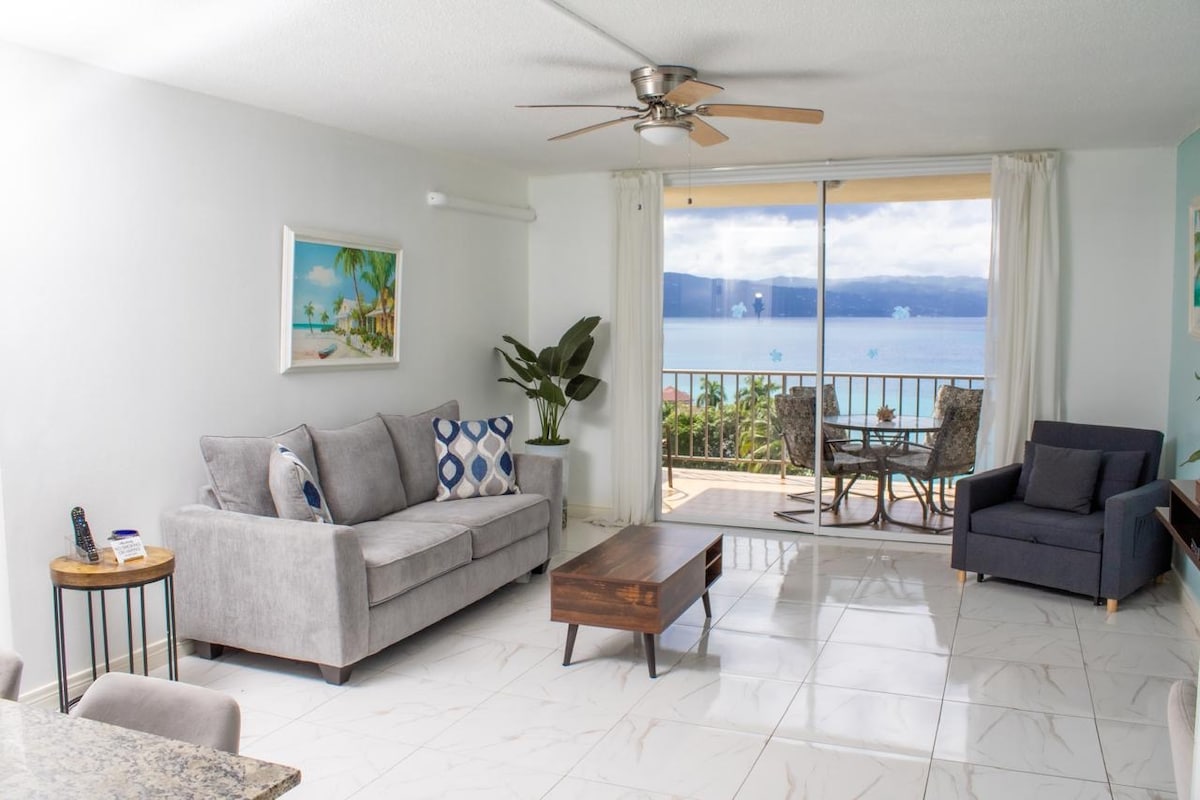 This exquisite 2-bedroom, 2-bathroom apartment with a pool & 24-hour security is ideally situated in Mo Bay. Providing breath taking ocean views close to the city's shopping and attractions. The fully equipped kitchen boasts all modern appliances. Rooms are luxuriously appointed & at your request the King bed in the 2nd bedroom can be converted into 2 twins. The washroom includes a washing machine and dryer. Stay connected with high-speed Wi-Fi throughout the apartment and smart televisions.