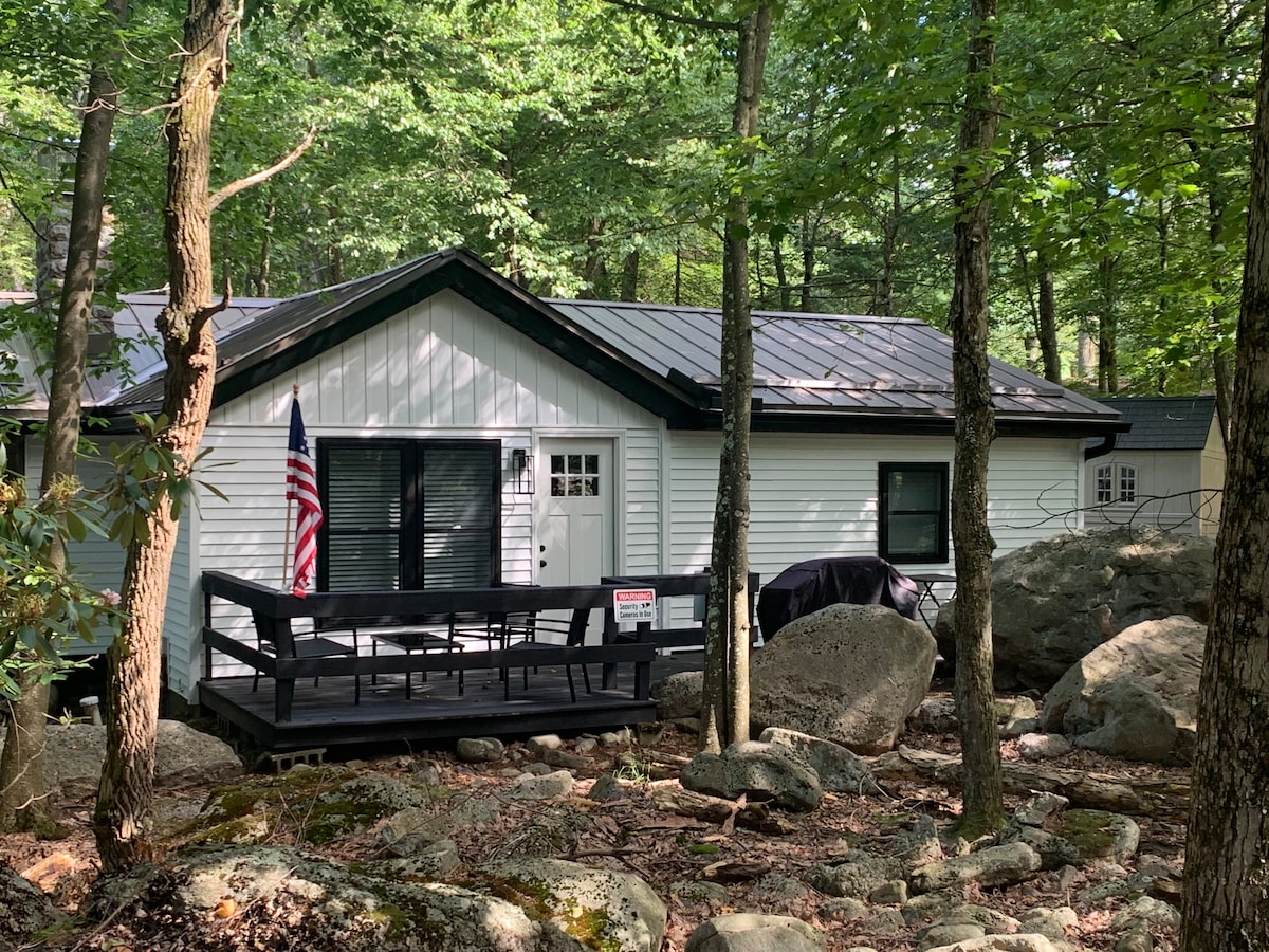 Boulder Cottage! Renovierte, traditionelle Hütte in einer ruhigen Gegend direkt am See, in der Nähe des Skigebiets Minuten von- - Split Rock Resorts H2Oooh! Wasserpark - Big Boulder und Jack Frost - Pocono Raceway - Hickory Run State Park - Jim Thorpe und Shopping Outlets - Holzkamin! Brennholz kann vor Ort gekauft werden. - Feuerstelle - Geschlossene Terrasse mit Blick in die Natur! - schnelles WLAN + Streaming-TV! - Vorrätig – Frische Bettwäsche, Handtücher, Kochutensilien! - Keine Haustiere erlaubt.