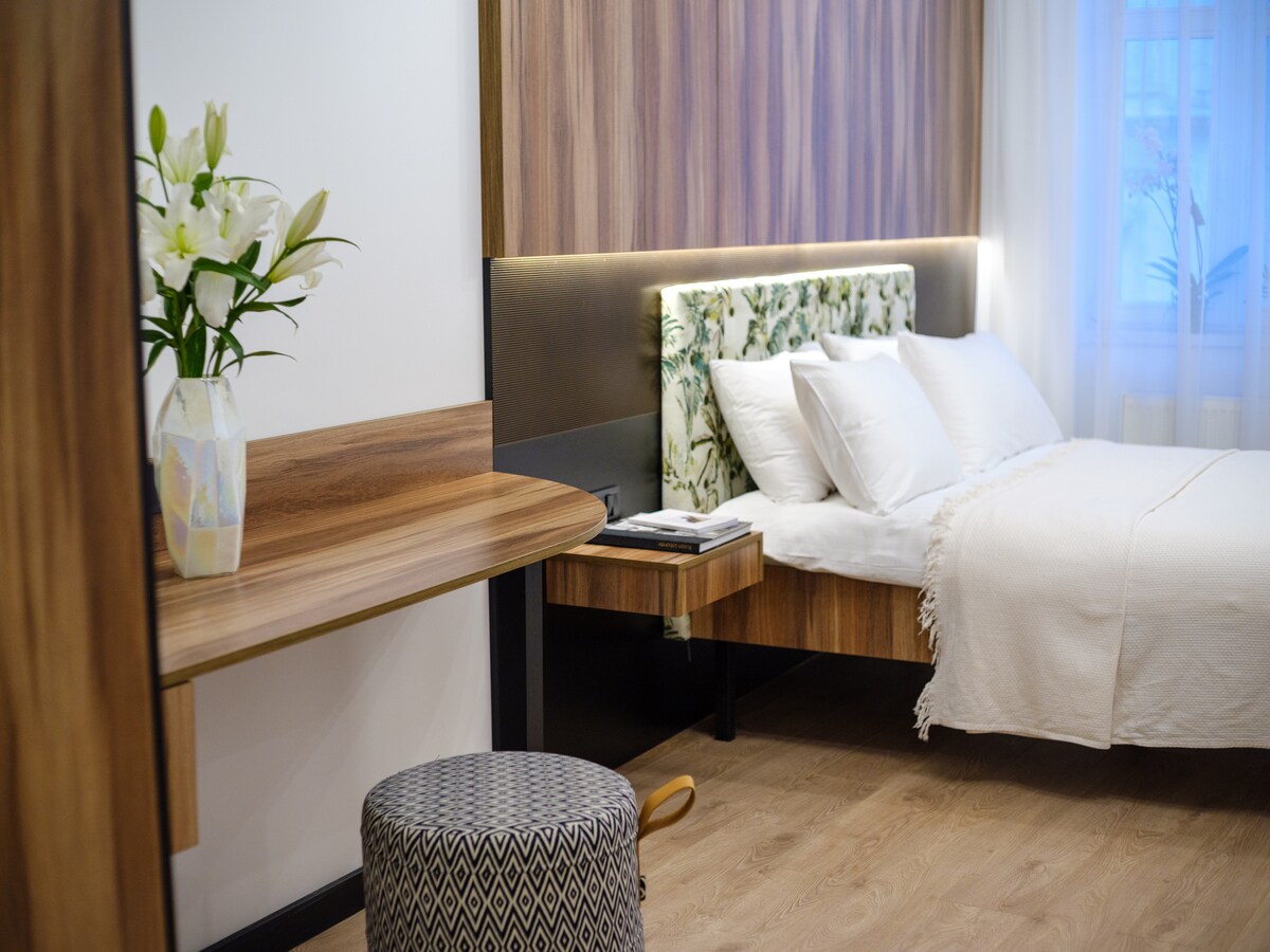 Ein Standardzimmer mit einem Kingsize-Bett oder (optional) zwei Einzelbetten mit orthopädischen Matratzen besteht im „minimalistischen“ Stil. Ein besonderes Highlight des Designs des Zimmers sind die antiken Fotos von Lwiw. Jedes Zimmer verfügt über „französische“ Fenster und Zugang zum Balkon, von dem aus du architektonische Denkmäler in Betracht ziehen kannst, während du an einem kleinen Tisch Kaffee trinkst. Und abends ist es besonders interessant, den Musikbrunnen vor dem Opernhaus zu betrachten.