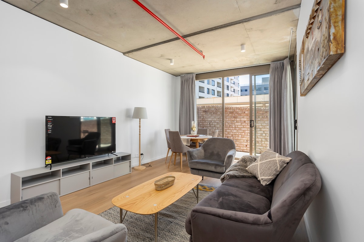 Die Wohnung ist geräumig und mit einem einzigartigen Industriestil ausgestattet, der freiliegende Ziegel, 3,4 m hohe Betondecken und freiliegende Rohrleitungen umfasst. Die Unterkunft verfügt über technische Holzdielen, die das industrielle Ambiente unterstreichen. Doppelschiebetüren öffnen sich zu einem überdachten Balkon mit Blick auf die Brindabella-Berge. Ursprünglich Mitte der 1960er Jahre erbaut und als Regierungsbüros genutzt, erlebten sie 2020 eine Wiedergeburt in diese atemberaubenden Wohnungen im Lagerhausstil.
