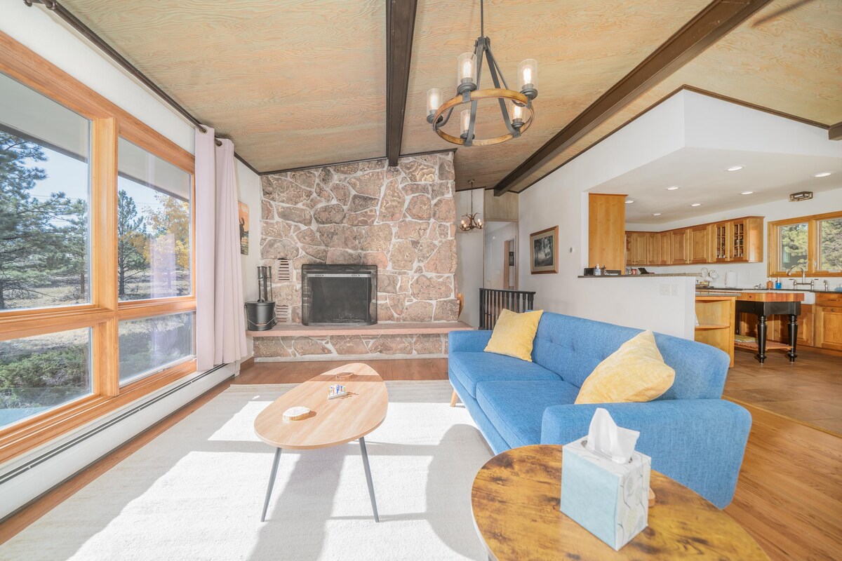 Genieße zwei gemütliche Kamine, einen epischen Bergblick, 5 Schlafzimmer und 2 Kingsize-Betten bei deinem nächsten Familienurlaub (Genehmigung 3258). Blocks vom Thumb Open Space entfernt, also wirst du wahrscheinlich Elche, Rehe, Kojoten, Rotluchse und sogar Bären aus dem Wohnzimmerfenster ausspionieren! Unsere 3150 s/f Lodge bietet Platz für 12 Personen und bietet einen Blick auf den Longs Peak. Komplett mit einem Spielzimmer für die Kinder, einer voll ausgestatteten Küche und einer Master Suite. - 5 Minuten bis in die Innenstadt - Airhockey & Videospiele - 10 Minuten zum Eingang des Nat'l Parks