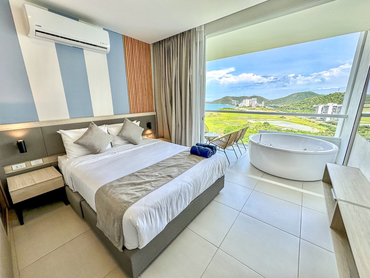 Entspanne dich in einem einzigartigen und ruhigen Rückzugsort mit Meerblick und einem privaten Whirlpool in der luxuriösen Apartment-Suite, genieße einen 70-Zoll-Fernseher und eine ausgestattete Küche. Das Hotel liegt in einem exklusiven Apartment-Hotel in der Touristengegend von Santa Marta, nur 3 Gehminuten vom schönsten Strand in Bello Horizonte entfernt, ideal für Paare oder 3 oder 4 Personen: Queen-Size-Bett Luxus-Matratze + Queen-Size-Nest. Kostenlose tägliche Reinigung. Genieße ein 5-Sterne-Hotel und erlebe etwas Neues. Jetzt buchen!