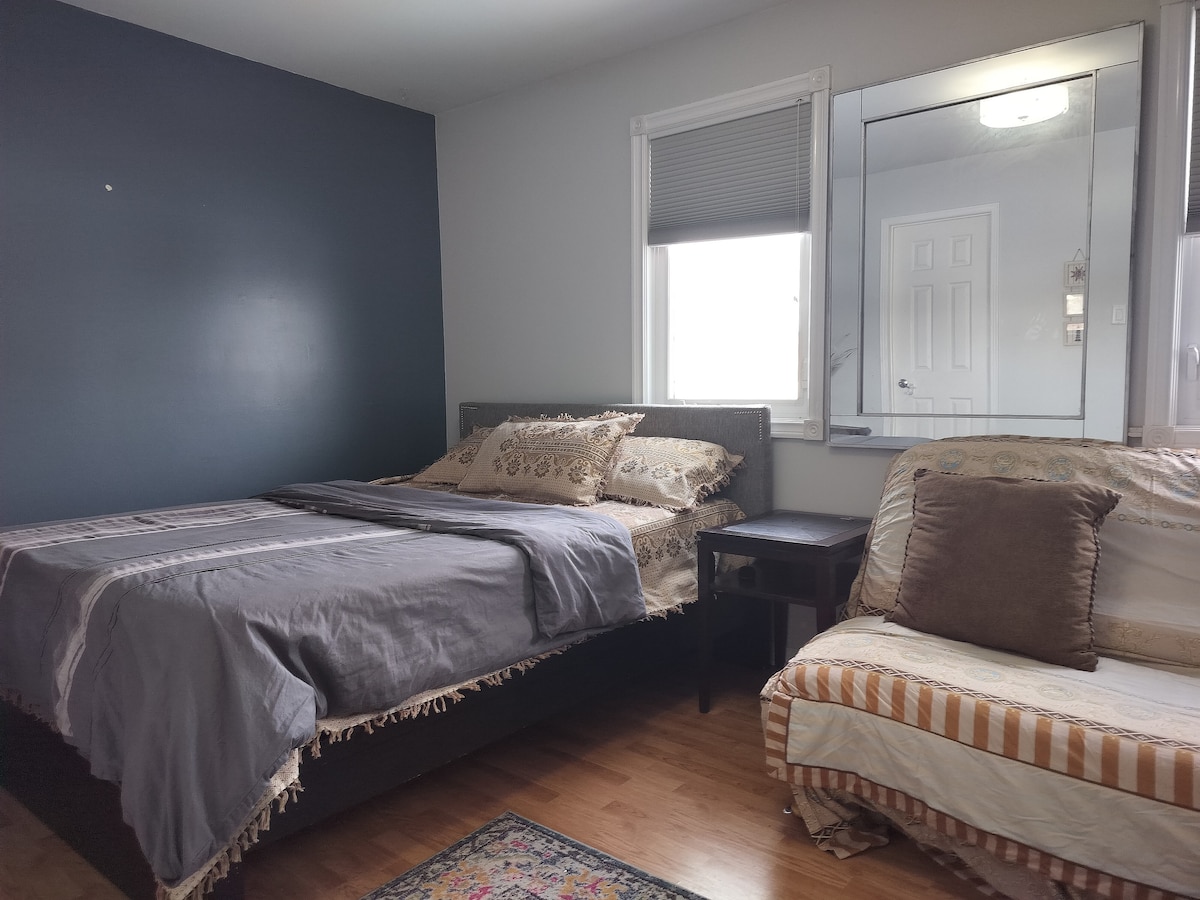 Entspanne dich mit der ganzen Familie in einem ruhigen, ruhigen Viertel. Günstig gelegen in der Nähe des Flughafens Pearson. Nur wenige Gehminuten vom Einkaufszentrum und dem Spielplatz und dem Park entfernt. Genieße den Aufenthalt in einer neu renovierten privaten Kellereinheit, einem Schlafzimmer, einer voll ausgestatteten Küche und einem Badezimmer. Unsere Unterkunft bietet Platz für bis zu 4 Gäste, ganz für sich, mit einem Queensize-Bett und einem ausziehbaren Tagesbett (Kingsize-Bett) im Wohnzimmer. Gerade angekommen? Kontaktiere uns für die Abholung vom Flughafen!