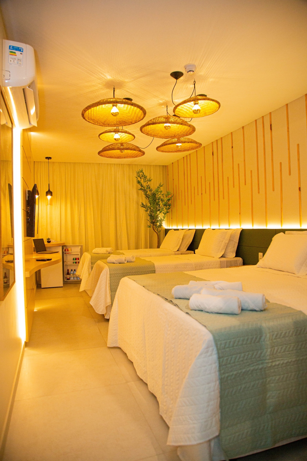 In den Schlafzimmern gibt es Fernseher mit Netflix, eine geteilte Klimaanlage, WLAN und eine Minibar mit Wasser, Limonade, Bier und Snacks, die zum Kauf angeboten werden.