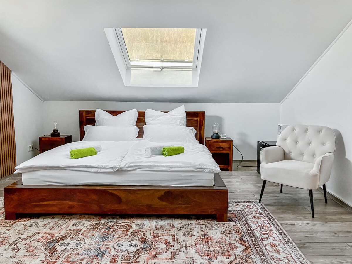 Fröhliche Farben und warme Holztöne durchziehen dieses offene und helle Apartment. Schon Morgens fallen die ersten Sonnenstrahlen durch die großen Fenster und begrüßen den Tag. Und bei trübem Wetter machst Du es Dir einfach auf dem Sofa neben dem Holzofen gemütlich. Der Schlafbereich mit einem Doppelbett und einem Etagenbett lässt sich mit großen, alten Schiebetüren abtrennen. Di-So Frühstück möglich in unserem Café.(Preise gemäß Frühstückskarte), EBike-Verleih, Panorama-Sauna, Weinverkauf