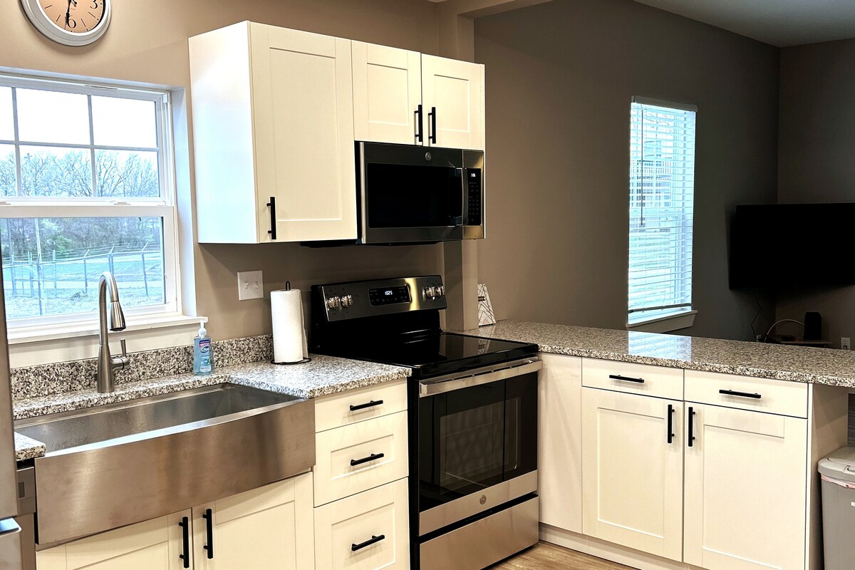 Schlaf ruhig in dieser 600 Quadratfuß großen, voll möblierten Gästewohnung an der I-70 Frontage in Oak Grove auf 18 Acres mit 2 Teichen und sanften Weiden. Eine Schotterauffahrt führt zum Grundstück, wo du einen Betonparkplatz und einen stufenlosen Pflasterweg zur Eingangstür der Wohnung hast. Ruhe dich auf einer Queensize-Tuft-n-Needle-Matratze in einem Schlafzimmer mit raumverdunkelnden Vorhängen und verschiedenen Kissen aus, um deinen Komfort zu gewährleisten. Voll ausgestattete Küche, Waschküche, 2 Smart-TVs.