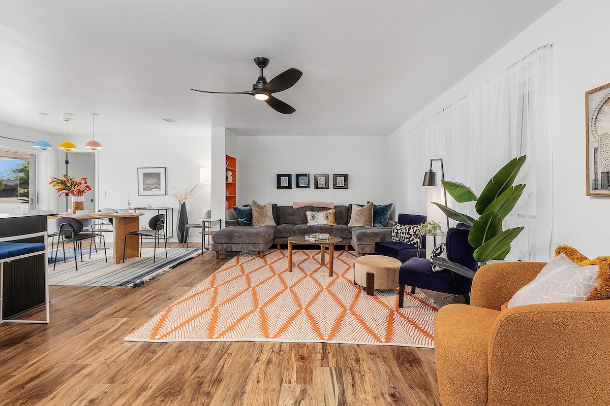 Dieses renovierte luxuriöse, charmante Haus mit 4 Schlafzimmern verfügt über atemberaubende Updates. Es handelt sich um eine ehemalige Model-Unterkunft. Es verfügt über 2 Hauptschlafzimmer-Suiten/private Badezimmer und Glasschiebetüren, die zum Pool- und Spa-Bereich führen, und 2 Schlafzimmer teilen sich ein Badezimmer. Wir lieben es, Baseballspieler, Pickleball-Enthusiasten und Familien zu beherbergen, die den Wasserpark oder Minigolf nur wenige Minuten entfernt genießen. Nur einen kurzen Spaziergang von The Courts entfernt, der neu ist, mit 32 Pickleballplätzen und 12 Tennisplätzen. Spiele entweder von 13:00 bis 15:00 Uhr KOSTENLOS.