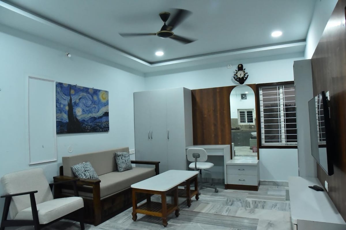 ● Independent ground-flr 1BHK in central Hyderabad,quiet, well-connected ● Bright living area, sofa & TV for relaxed stays ● Kitchenette with induction,fridge & light utensils for long stays ● Cozy Bedroom with bed,work desk & chair,ideal for WFH & exams ● Perfect for professionals,exam aspirants,remote workers ● Prime access:Charminar20min,Ramoji Film City45min,offices nearby ● Cafés,restaurants, supermarkets within walking distance ● Professionally co-hosted by The Homestay Academy